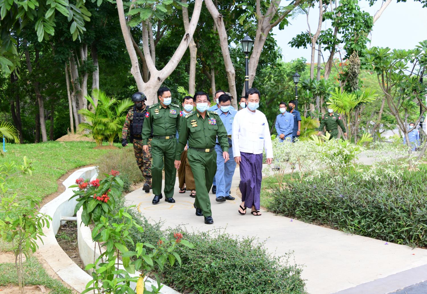 နိုင်ငံတော်စီမံအုပ်ချုပ်ရေးကောင်စီဥက္ကဋ္ဌ တပ်မတော်ကာကွယ်ရေးဦးစီးချုပ် ဗိုလ်ချုပ်မှူးကြီး မင်းအောင်လှိုင်သည် ကောင်စီဝင်များဖြစ်ကြသည့် ဗိုလ်ချုပ်ကြီး မြထွန်းဦး၊ ဒုတိယ ဗိုလ်ချုပ်ကြီး မိုးမြင့်ထွန်း၊ ကောင်စီအတွင်းရေးမှူး ဒုတိယ ဗိုလ်ချုပ်ကြီး အောင်လင်းဒွေး၊ တွဲဖက်အတွင်းရေးမှူး ဒုတိယဗိုလ်ချုပ်ကြီး ရဲဝင်းဦး၊ နေပြည်တော်ကောင်စီ ဥက္ကဋ္ဌ ဒေါက်တာ မောင်မောင်နိုင်၊ တာဝန်ရှိသူများနှင့်အတူ ယနေ့ညနေပိုင်းတွင် နေပြည်တော်၊ မင်္ဂလာ ကန်တော်ပတ်လမ်း တိုးချဲ့ တည်ဆောက်မည့် အခြေအနေနှင့် ရာဇဌာနီလမ်း ကုက္ကိုတန်းရှေ့ အလှမြက်ခင်းစိုက်မည့် မြေနေရာပြုပြင်နေမှု အခြေအနေများကို သွားရောက်ကြည့်ရှုစစ် ဆေးသည်။