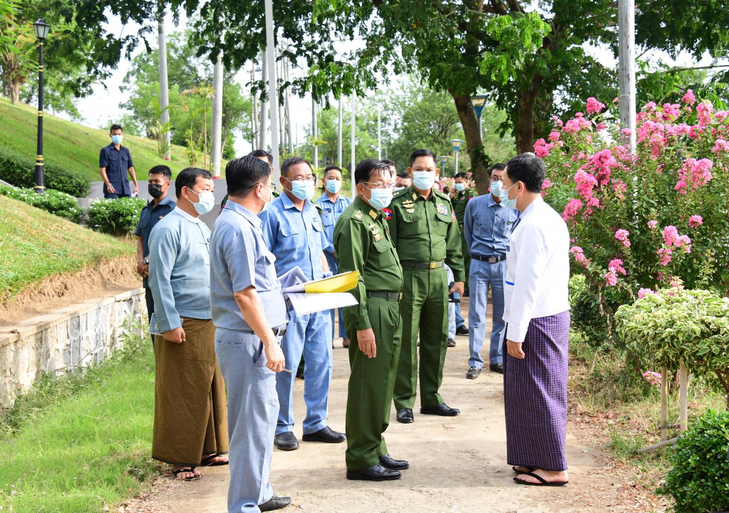 ဆက်လက်၍ နိုင်ငံတော်စီမံအုပ်ချုပ်ရေးကောင်စီဥက္ကဋ္ဌနှင့် အဖွဲ့ဝင်များသည် ရာဇဌာနီ လမ်း၊ ကုက္ကိုတန်းရှေ့ အလှမြက်ခင်းစိုက်ပျိုးရန် မြေနေရာပြုပြင် နေမှုအခြေအနေများကို သွားရောက်ကြည့်ရှုစစ်ဆေးရာ နေပြည်တော်မြို့တော်ဝန်၊ ဒုတိယမြို့တော်ဝန်နှင့် တာဝန်ရှိသူ များက ရှင်းလင်းတင်ပြကြသည်။ ရှင်းလင်း တင်ပြမှုများအပေါ် ကောင်စီဥက္ကဋ္ဌက မြို့တော် အင်္ဂါရပ်နှင့် ကိုက်ညီမှုရှိရန်၊ အချိန်မီပြီးစီးရန်နှင့် အခြားလိုအပ်သည်များကို မှာကြားသည်။