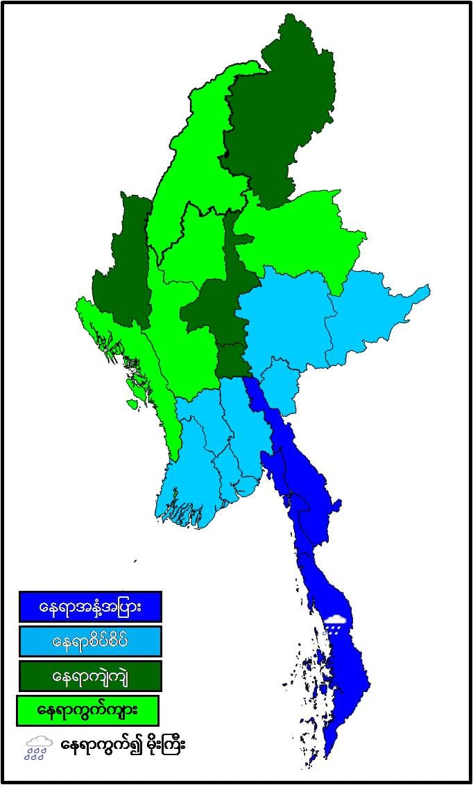 မနက်ဖြန်နံနက်အထိခန့်မှန်းချက်။ တနင်္သာရီတိုင်းဒေသကြီး၊ ကရင်ပြည်နယ်နှင့် မွန်ပြည်နယ်တို့တွင် နေရာအနှံ့အပြား၊ ပဲခူးတိုင်းဒေသကြီး၊ ရန်ကုန်တိုင်းဒေသကြီး၊ ဧရာဝတီတိုင်းဒေသကြီး၊ ရှမ်းပြည်နယ်(တောင်ပိုင်းနှင့် အရှေ့ပိုင်း)နှင့် ကယားပြည်နယ်တို့တွင် နေရာစိပ်စိပ်၊ နေပြည်တော်၊ မန္တလေးတိုင်းဒေသကြီး၊ ကချင်ပြည်နယ်နှင့် ချင်းပြည်နယ်တို့တွင် နေရာကျဲကျဲနှင့် ကျန်တိုင်းဒေသကြီးနှင့် ပြည်နယ်တို့တွင် နေရာကွက်ကျား မိုးထစ်ချုန်းရွာပြီး၊ တနင်္သာရီ တိုင်းဒေသကြီးတွင် နေရာကွက်၍ မိုးကြီးနိုင်ပါသည်။ ရွာရန်ရာနှုန်း (၈၀) ဖြစ်ပါသည်။