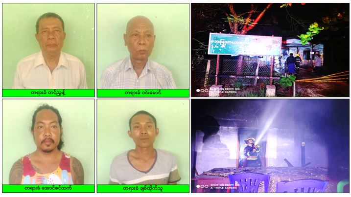 ထိုကဲ့သို့ နိုင်ငံတော်အုပ်ချုပ်မှုယန္တရားပျက်ပြားစေရန်နှင့် အများပြည်သူ အထိတ်တလန့် ဖြစ်စေရန် ရည်ရွယ်၍ ရပ်ကွက်စီမံအုပ်ချုပ်ရေးအဖွဲ့ရုံးအား မီးရှို့ဖျက်ဆီးမှုကျူးလွန်ခဲ့သည့် ရပ်ကွက်အုပ်ချုပ်ရေးမှူး အဟောင်းဖြစ်သူ တင်ညွှန့်ပါ အမျိုးသား ၄ ဦးအား ဥပဒေနှင့်အညီ ထိရောက်စွာ အရေးယူဆောင်ရွက်သွားမည်ဖြစ်ကြောင်း သတင်းရရှိသည်။ သတင်းစဉ်