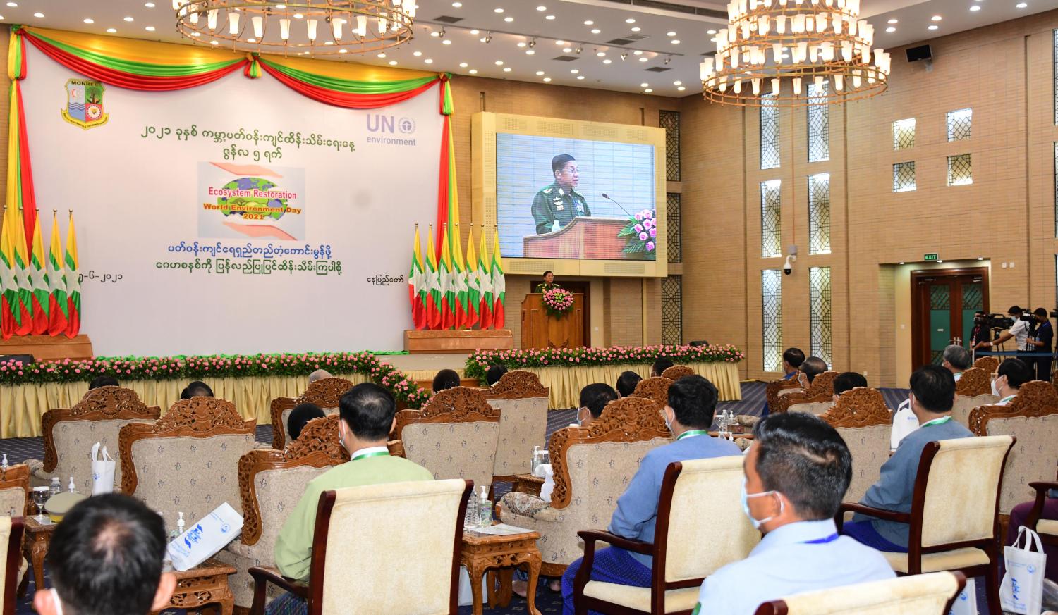 ၂၀၂၁ ခုနှစ်၊ ကမ္ဘာ့ပတ်ဝန်းကျင်ထိန်းသိမ်းရေးနေ့အခမ်းအနားကို ယနေ့နံနက် ပိုင်း တွင် နေပြည်တော်ရှိ မြန်မာအပြည်ပြည်ဆိုင်ရာကွန်ဗင်းရှင်း ဗဟိုဌာန-၂ ၌ ကျင်းပ ပြုလုပ်ရာ နိုင်ငံတော်စီမံအုပ်ချုပ်ရေးကောင်စီဥက္ကဋ္ဌ၊ တပ်မတော်ကာကွယ်ရေး ဦးစီး ချုပ် ဗိုလ်ချုပ်မှူးကြီး မင်းအောင်လှိုင် တက်ရောက်အမှာစကားပြောကြားသည်။