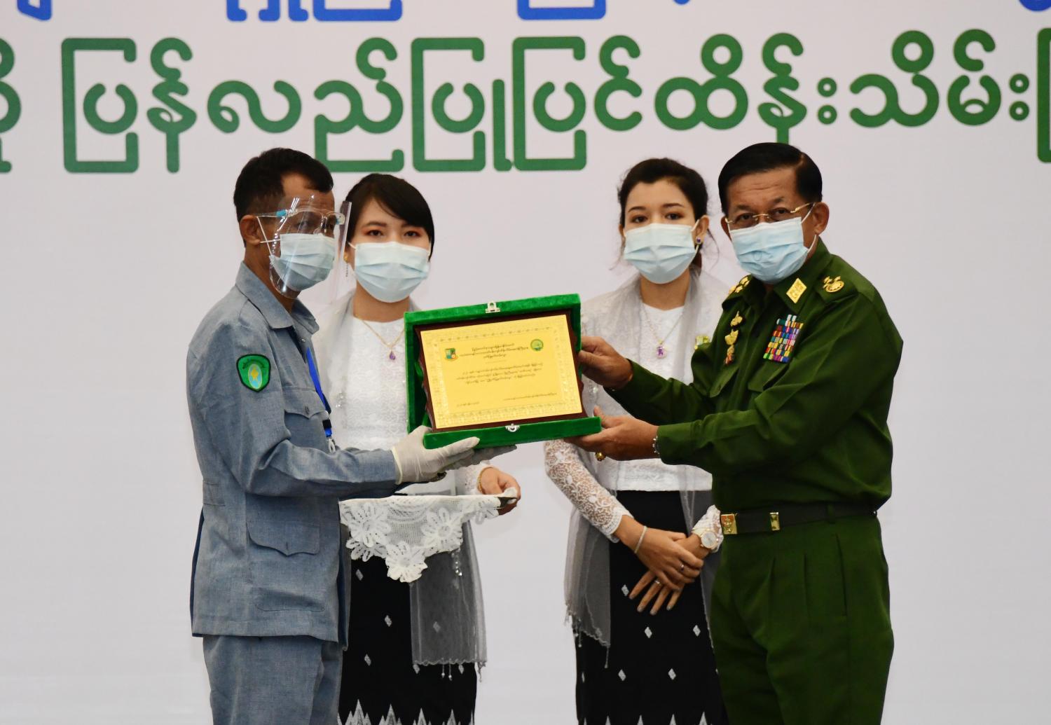 ဆက်လက်ပြီး နိုင်ငံတော်စီမံအုပ်ချုပ်ရေးကောင်စီဥက္ကဋ္ဌ၊ တပ်မတော်ကာကွယ် ရေး ဦးစီးချုပ် ဗိုလ်ချုပ်မှူးကြီး မင်းအောင်လှိုင် က ပတ်ဝန်းကျင်ဆိုင်ရာ စဉ်ဆက် မပြတ် ဖွံ့ဖြိုးသောမြို့ကြီးများအား ဆုများပေးအပ်ချီးမြှင့်ရာတွင် ပထမဆုရရှိသည့် ညောင်ဦးမြို့နယ် စည်ပင်သာယာရေးအဖွဲ့၊ ဒုတိယညွှန်ကြားရေးမှူး ဦးတင်မြင့်၊ ဒုတိယ ဆုရရှိသည့် ဝိုင်းမော်မြို့နယ်စည်ပင်သာယာရေးအဖွဲ့၊ ဒုတိယညွှန်ကြားရေးမှူး ဦးတင်မောင်ထွေး၊ တတိယဆုရရှိသည့် လွိုင်ကော်မြို့နယ် စည်ပင်သာယာရေးအဖွဲ့ ဒုတိယညွှန်ကြားရေးမှူး ဦးသန်းထွန်းတို့အား ဆုများအသီးသီးပေးအပ်ချီးမြှင့်သည်။