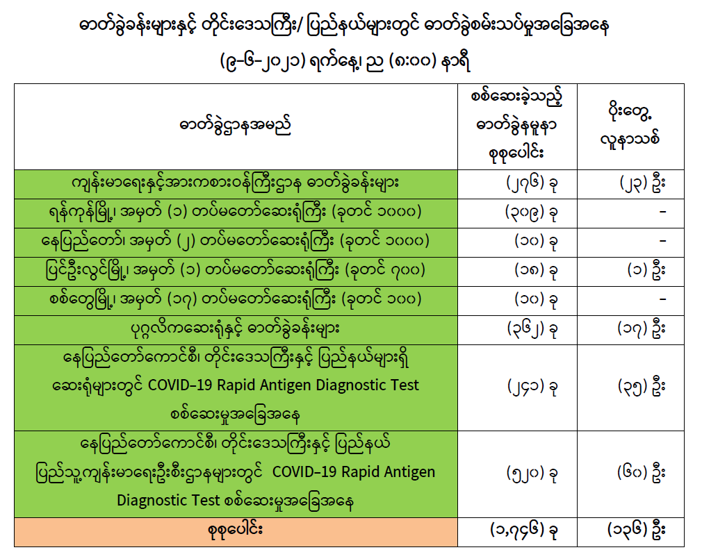 (၈-၆-၂၀၂၁) ရက်နေ့၊ ည (၈:၀၀) နာရီမှ (၉-၆-၂၀၂၁) ရက်နေ့၊ ည (၈:၀၀) နာရီအတွင်း ဓာတ်ခွဲနမူနာစုစုပေါင်း (၁,၇၄၆) ခုအား စစ်ဆေးပြီးစီးခဲ့ရာ COVID-19 ရောဂါ ဓာတ်ခွဲအတည်ပြု လူနာသစ် (၁၃၆) ဦး တွေ့ရှိရပါသည်။ သို့ဖြစ်ပါ၍ ယနေ့အထိ ဓာတ်ခွဲနမူနာ စုစုပေါင်း (၂,၆၃၆,၇၉၁) ခု အား စစ်ဆေးခဲ့ပြီး COVID-19 ဓာတ်ခွဲအတည်ပြုလူနာ စုစုပေါင်း (၁၄၄,၇၁၅) ဦး ရှိပြီ ဖြစ်ပါသည်။