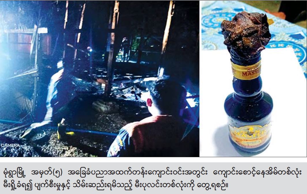 ဖြစ်စဉ်မှာ ဇွန်လ ၁၀ ရက်နေ့ ည ၈ နာရီ ၄၀ မိနစ်အချိန်တွင် စစ်ကိုင်းတိုင်းဒေသကြီး၊ မုံရွာမြို့၊ အောင်ချမ်းသာရပ်ကွက်၊ ဂေါက်ကွင်းတောင်ဘက်လမ်းရှိ အမှတ်(၅)အခြေခံပညာ အထက်တန်း ကျောင်းအား ကျောင်းသူ၊ ကျောင်းသားများ အေးချမ်းစွာ စာပေသင်ကြားမှုကို မလိုလားသည့် အကြမ်းဖက်သူ လူတစ်စုက မီးပုလင်းဖြင့် ပစ်ပေါက်ခဲ့မှုကြောင့် ကျောင်းဝင်းအတွင်း၌ မီးလောင်မှုဖြစ်ပွားခဲ့ပြီးမီးလောင်မှုကြောင့် သွပ်မိုး၊ ထရံကာ၊ ပျဉ်ခင်း ကျောင်းစောင့်နေအိမ် ၁ လုံး မီးလောင်ဆုံးရှုံးခဲ့ကာ အဆိုပါ နေရာအနီးမှ မီးစာတပ်ထားသည့် ဓာတ်ဆီပုလင်း ၁ လုံးအား တွေ့ရှိသိမ်းဆည်းရမိခဲ့ပြီး လူထိခိုက် ဒဏ်ရာရရှိမှုမရှိကြောင်း သိရသည်။