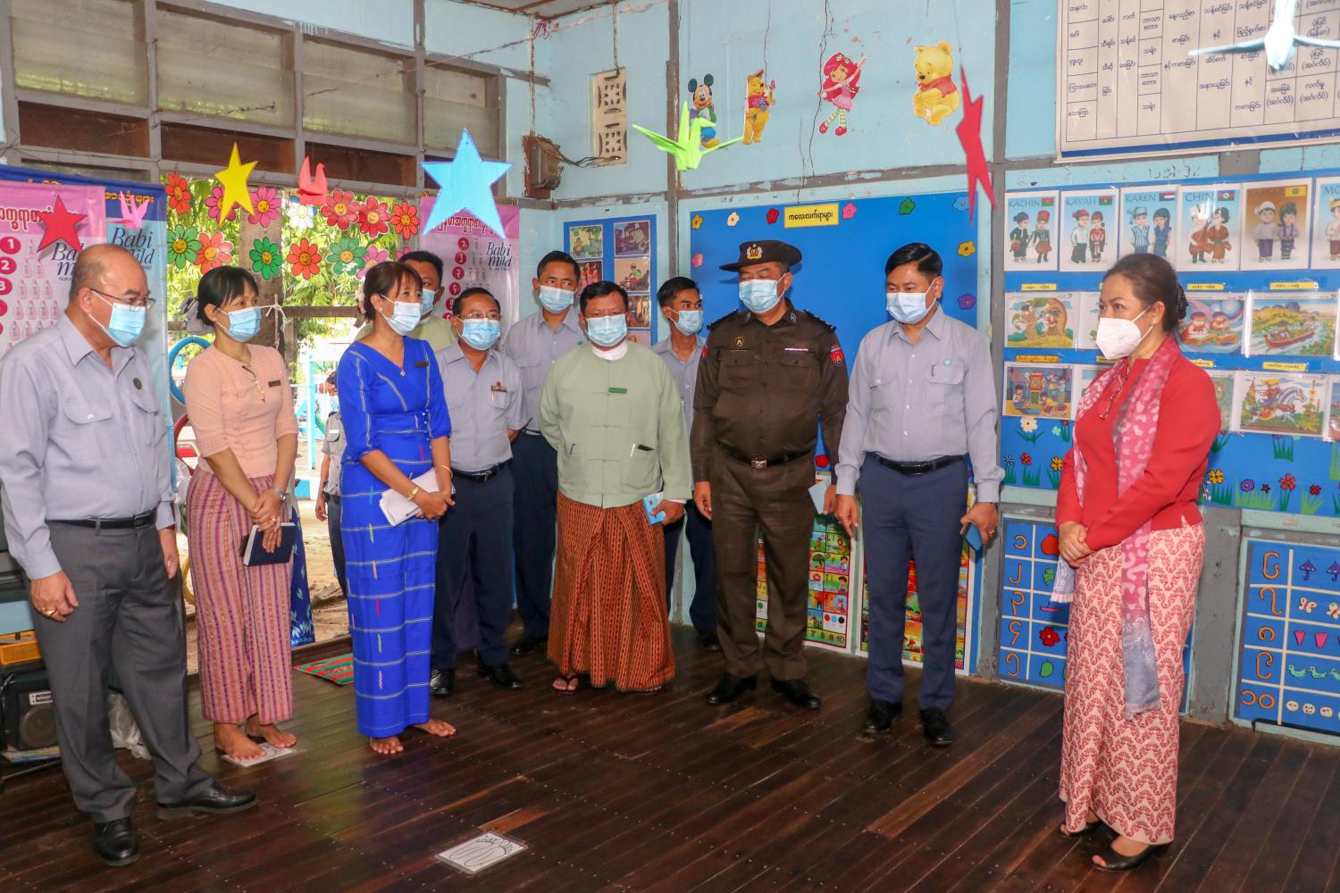 ဆက်လက်၍ ပြည်ထောင်စုဝန်ကြီးနှင့်အဖွဲ့သည် ပြည်မူလတန်းကြို ကျောင်းသို့ရောက် ရှိကြရာ တာဝန်ရှိသူများက မူလတန်းကြိုကျောင်းပြန်လည်ဖွင့်လှစ်နိုင်ရေး ပြင်ဆင်ဆောင်ရွက်ထားရှိမှု အခြေအနေများကို ရှင်းလင်းတင်ပြပြီး ပြည်ထောင်စုဝန်ကြီးနှင့် တာဝန်ရှိသူများက စာသင်ခန်း၊ ကလေးများ ကစားရာနေရာ၊ သင်ထောက်ကူအသုံးအဆောင် ပစ္စည်းများနှင့် ထမင်းစားခန်းများ အား လိုက်လံကြည့်ရှုစစ်ဆေးကာ ပြည်ထောင်စုဝန်ကြီးက ဝန်ထမ်းများနှင့် ရင်းရင်းနှီးနှီး တွေ့ဆုံနှုတ်ဆက် အားပေးခဲ့ကြောင်း သိရသည်။