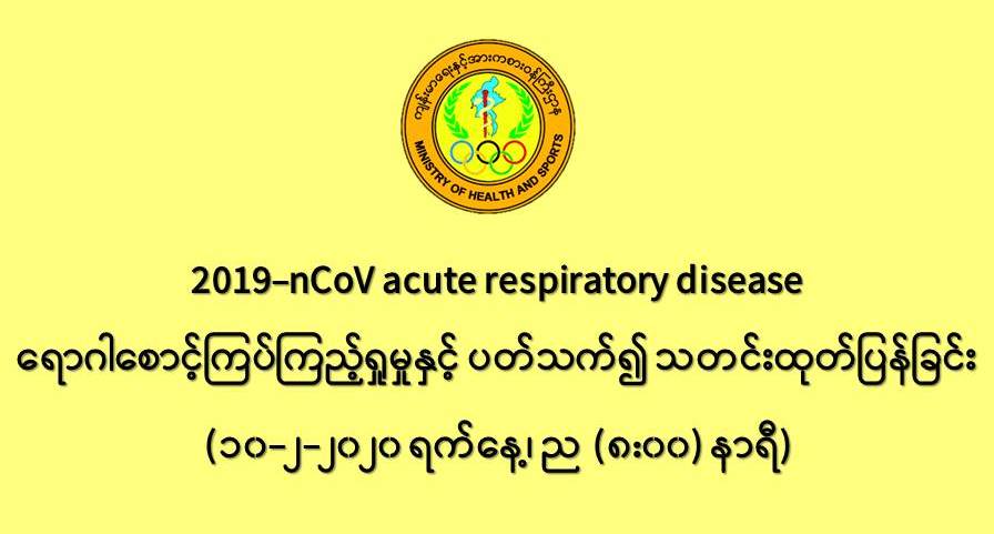 ၁။ ကျန်းမာရေးနှင့်အားကစားဝန်ကြီးဌာနသည် တရုတ်ပြည်သူ့သမ္မတနိုင်ငံနှင့် ကမ္ဘာ့နိုင်ငံ အချို့တွင် ကူးစက်ပျံ့နှံ့လျက်ရှိသည့် 2019-nCoV လတ်တလောအသက်ရှူလမ်းကြောင်းဆိုင်ရာ ရောဂါ ဖြစ်ပွားမှုဖြစ်စဉ်နှင့်ပတ်သက်၍ ရောဂါစောင့်ကြပ်ကြည့်ရှုခြင်း လုပ်ငန်းများအား အပြည်ပြည် ဆိုင်ရာ ဝင်ထွက်ဂိတ်များတွင်လည်းကောင်း၊ ဆေးရုံအခြေပြုအဖြစ်လည်းကောင်း၊ ပြည်သူလူထု အခြေပြု စောင့်ကြပ်ကြည့်ရှုခြင်းလုပ်ငန်းများဖြင့်လည်းကောင်း၊ ပုဂ္ဂလိကဆေးရုံများနှင့် ပူးပေါင်း၍ လည်းကောင်း ဆောင်ရွက်လျက်ရှိပါသည်။