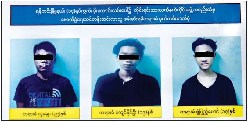 အလားတူ KNU အဖွဲ့ ထံမှ ဖောက်ခွဲ ရေး သင်တန်းတက်ရောက်ပြီး ပြန်လာသည့် လူချော၊ ကျော်နိုင်ဦးနှင့် ဇွဲပြည့် မောင်တို့ ၃ ဦးကို ၂၀၂၁ ခုနှစ် ဇွန်လ ၈ ရက်နေ့က ရန်ကင်းမြို့နယ်တွင် ဖမ်းဆီးရမိခဲ့ပါကြောင်း၊ ၎င်းတို့၏ထွက်ဆိုချက်များအရ ကျုံပျော်မြို့မှ NLD ပါတီဝင် ဇော်မျိုးအောင်က ကျောက်ကြီး၊ မုန်း၊ ဇရပ်ကြီး ဒေသရှိ KNU မှ ဖွင့်လှစ်သည့်သင်တန်းကို ၎င်းတို့အားပို့ဆောင်ခဲ့ကြောင်း၊ သင်တန်း ကိုရောက်ရှိရန် NLDအားပေးထောက်ခံသူ ရှေ့နေ ဦးယုယချစ် က ကူညီခဲ့ကြောင်း၊ မေလ ၂၆ ရက်နေ့တွင် ရန်ကုန်သို့ရောက်ပြီး စမ်းချောင်းမြို့နယ် အခြေခံပညာ အထက်တန်းကျောင်းအနီးနှင့် ရန်ကုန်အင်းစိန်လမ်းမကြီး ဘူတာရုံလမ်း မှတ်တိုင်အနီး မိုင်းထောင်၊ မိုင်းခွဲမှုများ ပြုလုပ်ခဲ့သည်ကို သိရှိရပါကြောင်း။