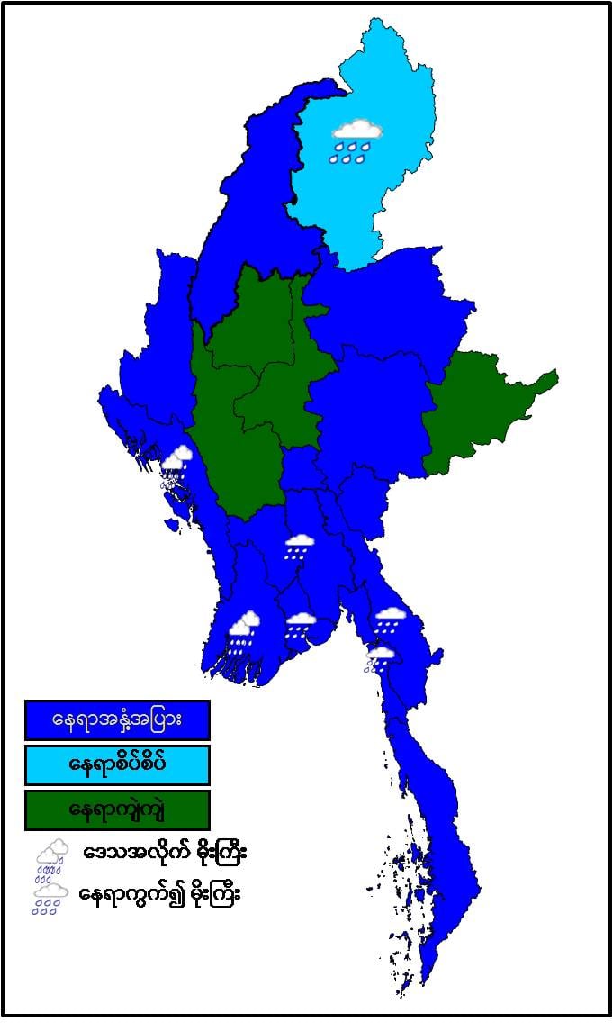 မနက်ဖြန်နံနက်အထိခန့်မှန်းချက်။စစ်ကိုင်းတိုင်းဒေသကြီးအောက်ပိုင်း၊ မန္တလေးတိုင်းဒေသကြီး၊ မကွေးတိုင်းဒေသကြီးနှင့် ရှမ်းပြည်နယ်(အရှေ့ပိုင်း)တို့တွင် နေရာကျဲကျဲ၊ ကချင်ပြည်နယ်တွင် နေရာစိပ်စိပ်နှင့် ကျန်တိုင်းဒေသကြီးနှင့် ပြည်နယ်တို့တွင် နေရာအနှံ့အပြား မိုးထစ်ချုန်းရွာပြီး၊ ဧရာဝတီတိုင်းဒေသကြီးနှင့် ရခိုင်ပြည်နယ်တို့တွင် ဒေသအလိုက်နှင့် ပဲခူးတိုင်းဒေသကြီး၊ ရန်ကုန်တိုင်းဒေသကြီး၊ ကချင်ပြည်နယ်၊ ကရင်ပြည်နယ်နှင့် မွန်ပြည်နယ်တို့တွင် နေရာကွက်၍ မိုးကြီးနိုင်ပါသည်။ ရွာရန်ရာနှုန်းပြည့် ဖြစ်ပါသည်။