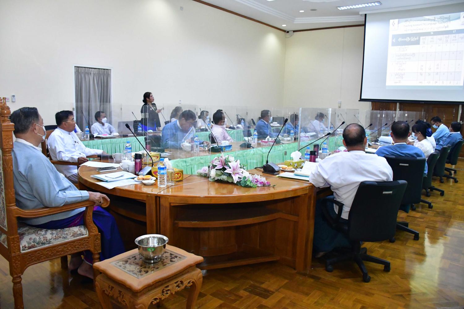 ဆက်လက်၍ ဒုတိယဝန်ကြီး ဦးဇော်အေးမောင်က Teaching Assistant(TA)နှင့် Language Teacher(LT) ဆရာ/ဆရာမများ ခန့်ထားခြင်းအပေါ် သုတေသနပြု လေ့လာပြီး တိုးတက်မှုရလဒ်ကို အစီရင်ခံစာပြုစု၍ တိုင်းပြည်အတွက် အကျိုးပြုမှုကို တင်ပြရန်လိုအပ်ပါ ကြောင်း ပြောကြားသည်။ ထို့နောက် တိုင်းရင်းသားစာပေနှင့် ယဉ်ကျေးမှုဦးစီးဌာန၊ ညွှန်ကြားရေးမှူးချုပ် ဦးဝင်းနိုင်နှင့် တိုင်းရင်းသားစာပေနှင့်ယဉ်ကျေးမှုဦးစီးဌာန၊ ညွှန်ကြားရေးမှူး ဒေါ်တင်တင်နွယ်တို့က ကဏ္ဍအလိုက် ရှင်းလင်းတင်ပြကြပြီး ပြည်ထောင်စုဝန်ကြီးက နိဂုံးချုပ်အမှာစကား ပြောကြားသည်။