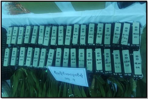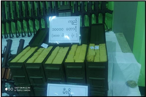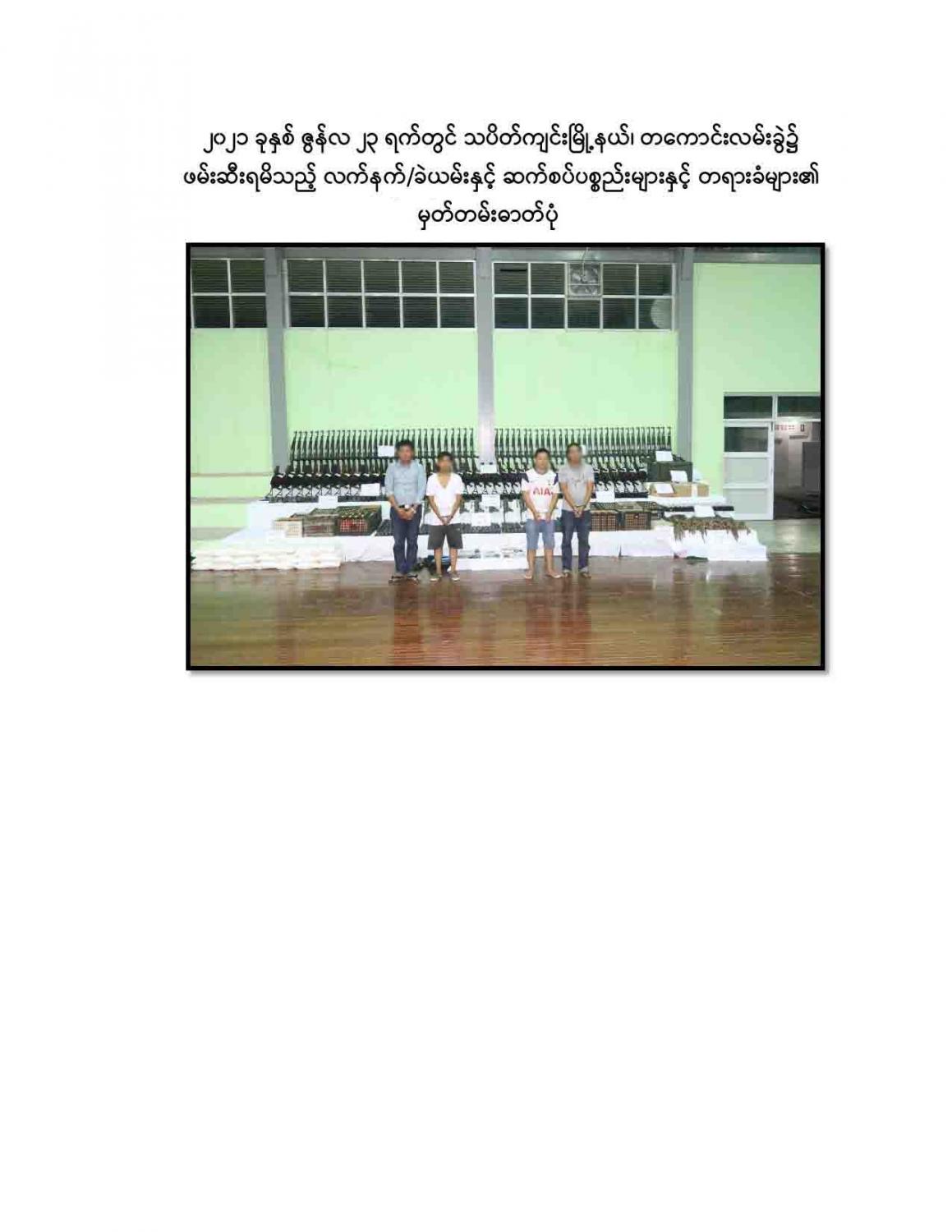 ဖမ်းဆီးရမိတရားခံများအား ဆက်လက်စစ်ဆေးမေးမြန်းချက်အရ လက်နက်/ ခဲယမ်းများအား ၆ ဘီးယာဉ်  ၁ စီးဖြင့် သယ်ဆောင်လာကြောင်း သိရှိရသဖြင့် ဖမ်းဆီး ရမိရေးဆောင်ရွက်ခဲ့ရာ ညနေပိုင်းတွင် မန္တလေး-ဗန်းမော် ကားလမ်း မိုင်တိုင် အမှတ်(၂၅)၊ ဝါးရုံကုန်းကျေးရွာ၌ Nissan အမျိုးအစား ယာဉ်အမှတ်၊ 8B-9757 ၆ ဘီးယာဉ်ဖြင့် သယ်ဆောင်လာသော K 2-5 အရှည် ၃၂ လက်၊ K 2-5(ခေါက်ဒင်) ၃၂ လက်၊ M-79 LL ၄၀ လက်၊ 779 Pading III-S ၁၀ လက်၊ စုစုပေါင်း လက်နက်မျိုးစုံ ၁၁၄ လက်၊ ကျည်အိမ် ၂၄၈ ခု၊ K 2-5 ကျည် ၁၀,၀၀၀ တောင့်၊ လက်ပစ်ဗုံး ၄၉၉ လုံး၊ ၄၀ မမ ဗုံးသီး ၁,၄၇၃ လုံး၊ Remote Control မိုင်းအဝေးထိန်းခလုတ် ၃၅ ခု၊ ယမ်းမှုန့်ဟုယူဆ ရသောအထုပ် ၂၅ ထုပ်(၄.၉၆၅ ကီလိုဂရမ်)၊ လွယ်ကြိုး ၁၅၀ ချောင်း၊ လျှပ်စစ်စနက်တံ ၁ ခွေနှင့် ဒီတိုနေတာ ၃ ဖာတို့အား ဖမ်းဆီးရမိခဲ့သည်။