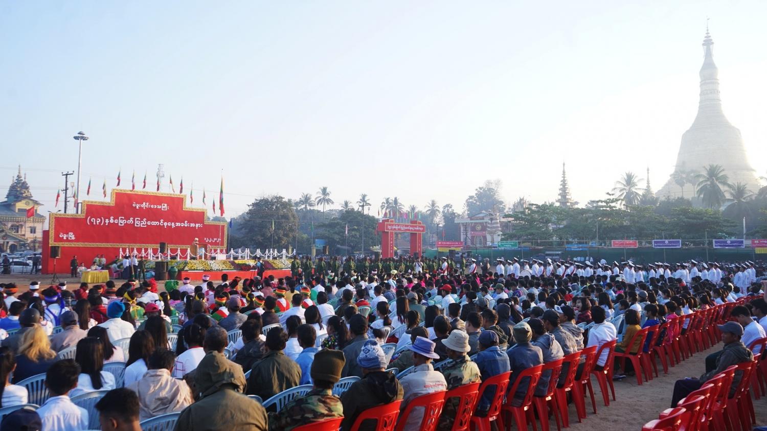 ရှေးဦးစွာ နံနက် ၅နာရီခွဲ အချိန်တွင် ဂုဏ်ပြုတပ်ဖွဲ့က ပြည်ထောင်စုသမ္မတမြန်မာနိုင်ငံတော်အလံအား စင်မြင့်ပေါ်ရှိ တိုင်ထိပ်တွင်လွှင့်တင်ကြပြီး နိုင်ငံတော်အလံအား အလေးပြုကြသည်။