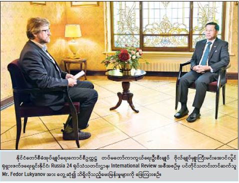 ရုရှားဖက်ဒရေးရှင်းနိုင်ငံသို့ ရောက်ရှိနေသည့် နိုင်ငံတော်စီမံအုပ်ချုပ်ရေးကောင်စီဥက္ကဋ္ဌ တပ်မတော်ကာကွယ်ရေးဦးစီးချုပ် ဗိုလ်ချုပ်မှူးကြီးမင်းအောင်လှိုင်သည် ဇွန် ၂၂ ရက် နံနက်ပိုင်းတွင် ရုရှားဖက်ဒရေးရှင်းနိုင်ငံ၊ Russia 24 ရုပ်သံသတင်းဌာန၊ International Review အစီအစဉ်မှ ပင်တိုင်သတင်း တင်ဆက်သူ Mr.Fedor Lukyanov အား ခေတ္တတည်းခိုလျက်ရှိသည့် Metropol Hotel ၌တွေ့ဆုံ၍ သိရှိလိုသည့် မေးမြန်းမှုများကို လက်ခံဖြေကြားသည်။ အဆိုပါ မေးမြန်းမှုများနှင့် ဖြေကြားမှုများကို ဖော်ပြလိုက်ရပါသည်-