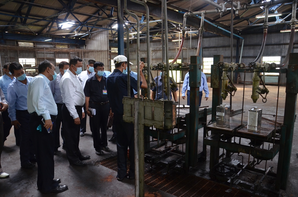 ရှေးဦးစွာ ပြည်ထောင်စုဝန်ကြီးနှင့်အဖွဲ့သည် သန်လျင်မြို့နယ်ရှိ မြန်မာ့ရေနံဓာတု ဗေဒလုပ်ငန်း၊ အမှတ်(၁) ရေနံချက်စက်ရုံဝင်းအတွင်းရှိ စက်ဆီ/ချောဆီ ရောစပ်စက်ရုံသို့ ရောက်ရှိရာ ဦးဆောင်ညွှန်ကြားရေးမှူး ဦးအောင်မြင့်နှင့်တာဝန်ရှိသူများက လုပ်ငန်းများ ဆောင်ရွက်နေမှု တို့ကို ရှင်းလင်းတင်ပြရာ ပြည်ထောင်စုဝန်ကြီးက လိုအပ်သည်များ မှာကြားခဲ့ပြီး စက်ဆီ/ချောဆီ စက်ရုံအတွင်း ပြုပြင်မွမ်းမံခြင်းလုပ်ငန်း ဆောင်ရွက်နေမှုတို့ကို ကြည့်ရှု စစ်ဆေးသည်။