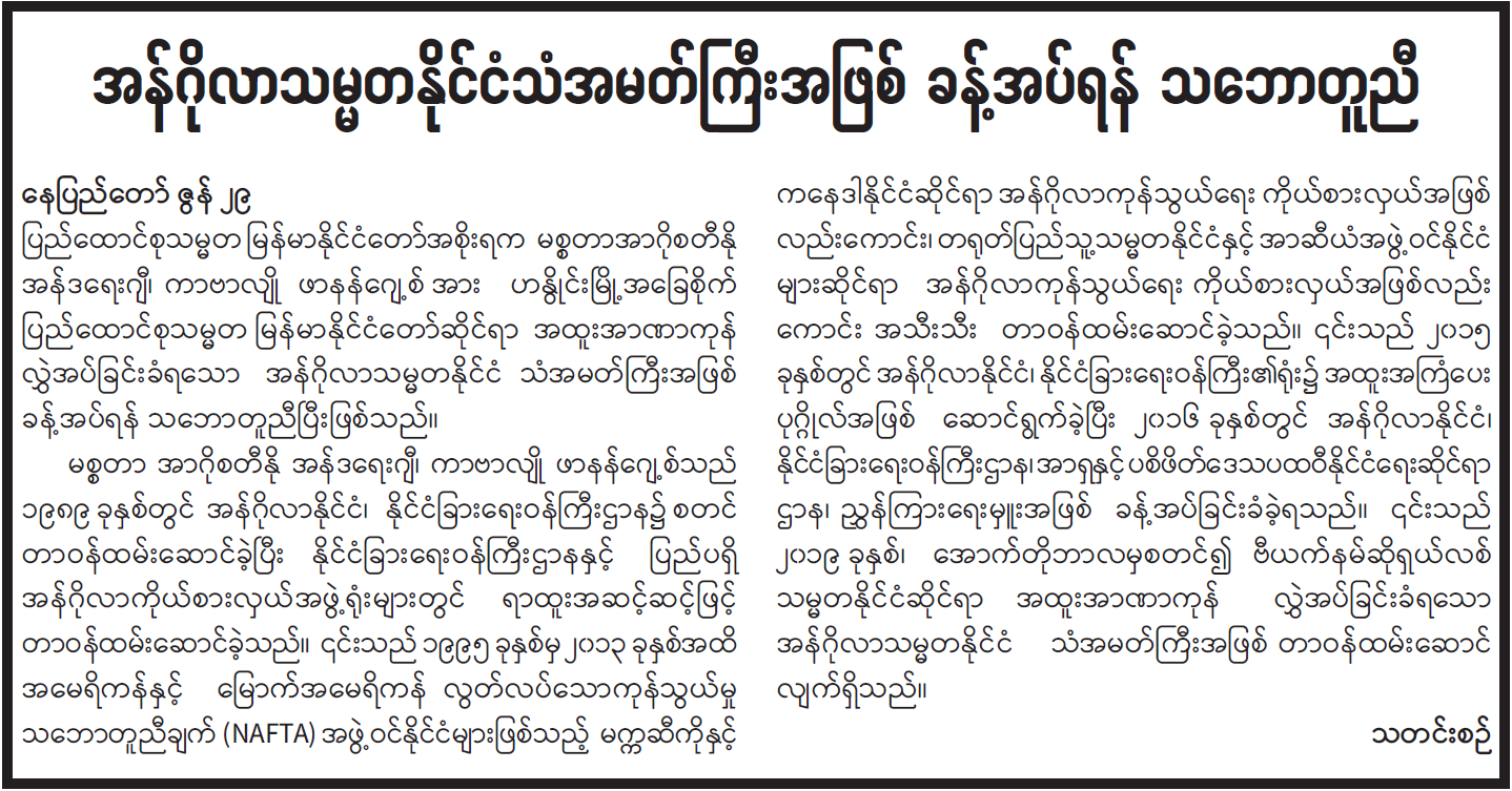 အန်ဂိုလာသမ္မတနိုင်ငံသံအမတ်ကြီးအဖြစ် ခန့်အပ်ရန် သဘောတူညီ