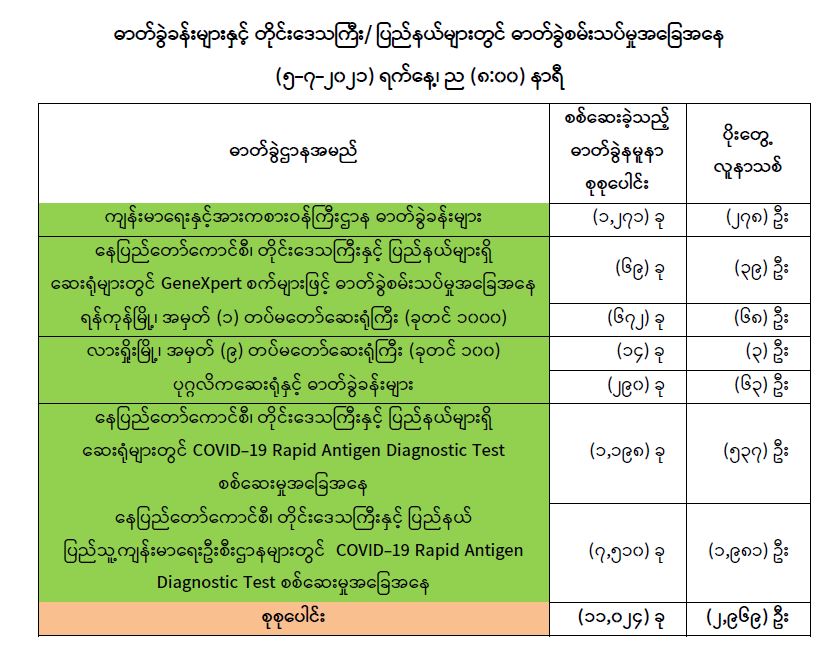 (၄-၇-၂၀၂၁) ရက်နေ့၊ ည (:၀၀) နာရီမှ (--၂၀၂၁) ရက်နေ့၊ ည (:၀၀) နာရီအတွင်း ဓာတ်ခွဲနမူနာစုစုပေါင်း (၁၁,၀၂၄) ခုအား စစ်ဆေးပြီးစီးခဲ့ရာ COVID-19 ရောဂါ ဓာတ်ခွဲ အတည်ပြု လူနာသစ် (၂,၉၆၉) ဦး တွေ့ရှိရပါသည်။ သို့ဖြစ်ပါ၍ ယနေ့အထိ ဓာတ်ခွဲနမူနာ စုစုပေါင်း (,၇၈၃,၃၈၅)ခု အား စစ်ဆေးခဲ့ပြီး COVID-19 ဓာတ်ခွဲအတည်ပြုလူနာ စုစုပေါင်း (,၃၄) ဦးရှိပြီ ဖြစ်ပါသည်။