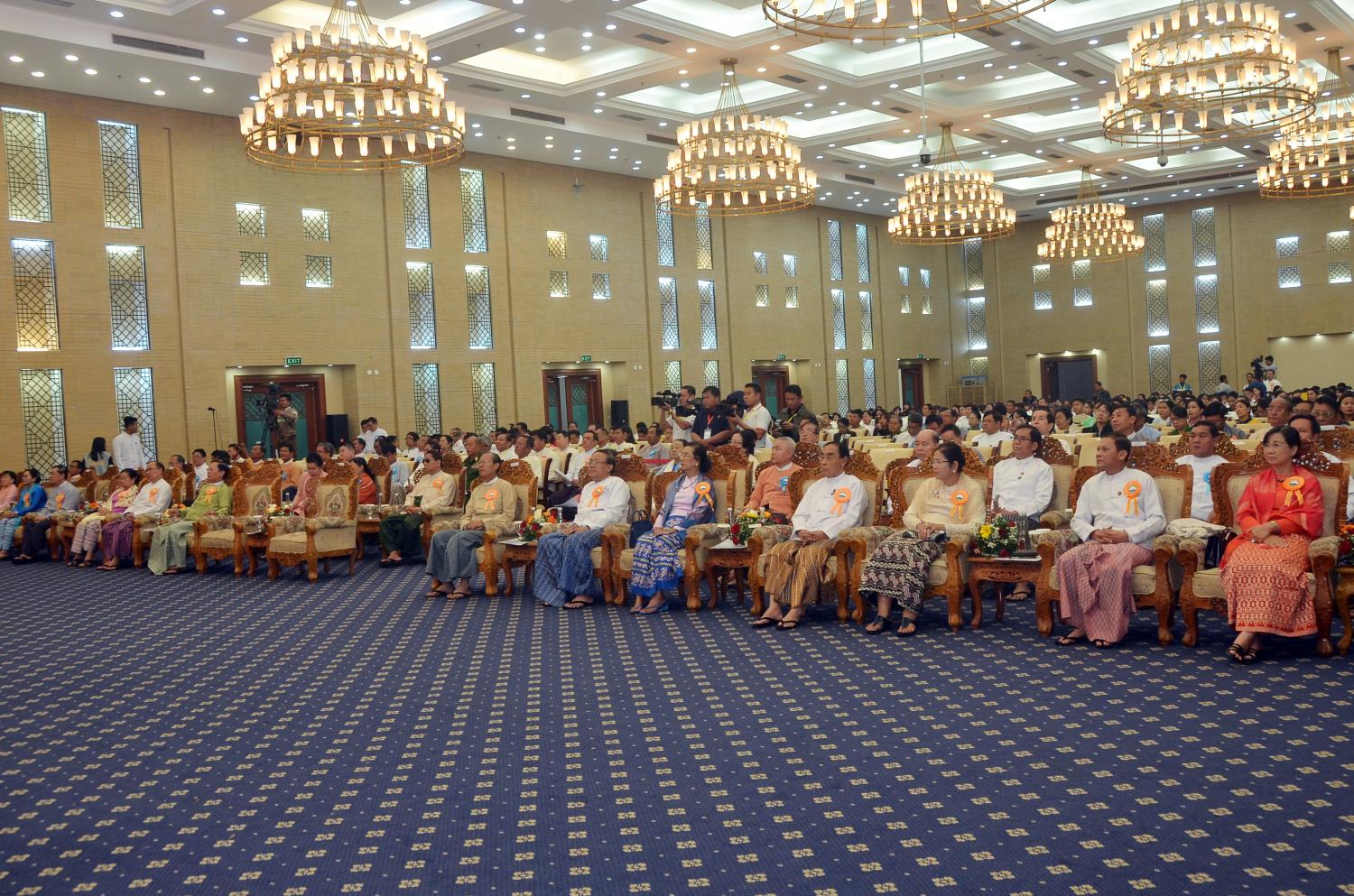 အခမ်းအနားသို့ ပြည်ထောင်စုဝန်ကြီးများဖြစ်ကြသည့် ဦးကျော်တင်၊ ဒေါက်တာ ဖေမြင့်၊ သူရဦးအောင်ကို၊ ဦးသန့်စင်မောင်၊ ဦးသိန်းဆွေနှင့် နိုင်သက်လွင်၊ ပြည်ထောင်စု ရှေ့နေချုပ် ဦးထွန်းထွန်းဦး၊ နေပြည်တော်ကောင်စီဥက္ကဋ္ဌ ဒေါက်တာမျိုးအောင်၊ မြန်မာနိုင်ငံ အမျိုးသားလူ့အခွင့်အရေးကော်မရှင် ဥက္ကဋ္ဌ ဦးလှမြင့်နှင့် ၎င်းတို့၏ ဇနီးများ၊ ဒုတိယ ဝန်ကြီးများဖြစ်ကြသည့် ဦးခင်မောင်တင်၊ ဦးအောင်လှထွန်း၊ ဦးကြည်မင်းနှင့် ဦးအောင်ထူး၊ ဒုတိယရှေ့နေချုပ် ဦးဝင်းမြင့်၊ ပြည်ထောင်စု တရားလွှတ်တော်ချုပ်တရားသူကြီးများ၊ နိုင်ငံတော်ဖွဲ့စည်းပုံ အခြေခံဥပ ဒေဆိုင်ရာခုံရုံး အဖွဲ့ဝင်များ၊ ပြည်ထောင်စုရွေးကောက်ပွဲ ကော်မရှင်အဖွဲ့ဝင်များ၊ လွှတ်တော်ရေးရာ ကော်မတီဥက္ကဋ္ဌများ၊ နေပြည်တော်ကောင်စီဝင် များ၊ အဂတိလိုက်စားမှုတိုက် ဖျက်ရေးကော်မရှင် အဖွဲ့ဝင်များ၊ မြန်မာနိုင်ငံအမျိုးသား လူ့အခွင့်အရေးကော်မရှင် အဖွဲ့ဝင်များ၊ နေပြည်တော်ဗိုလ်ချုပ် အောင်ဆန်း ကြေးရုပ်တု ဖြစ်မြောက်ရေးဦးစီးကော်မတီဝင်များ၊ နေပြည်တော် စည်ပင်သာယာရေးကော်မတီဝင်များ၊ ဆရာ ဆရာမများ၊ ကျောင်းသားကျောင်းသူများ၊ အလှူရှင်များ၊ ဖိတ်ကြား ထားသူများနှင့် တာဝန်ရှိသူများတက်ရောက်ကြသည်။