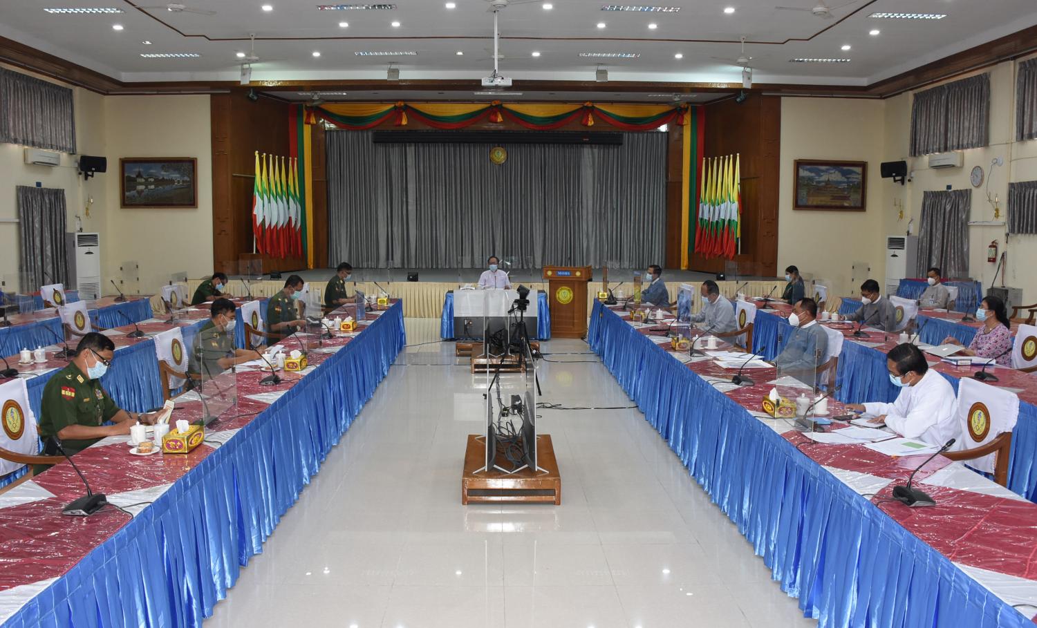 ကိုဗစ်-၁၉ ရောဂါ ကာကွယ်ထိန်းချုပ်ရေး လုပ်ငန်းညှိနှိုင်း အစည်းအဝေးကို ယနေ့နံနက်ပိုင်းတွင် ကျန်းမာရေးနှင့် အားကစားဝန်ကြီးဌာန၊ ရုံးအမှတ် (၄) အစည်းအဝေးခန်းမ၌ ကျင်းပသည်။