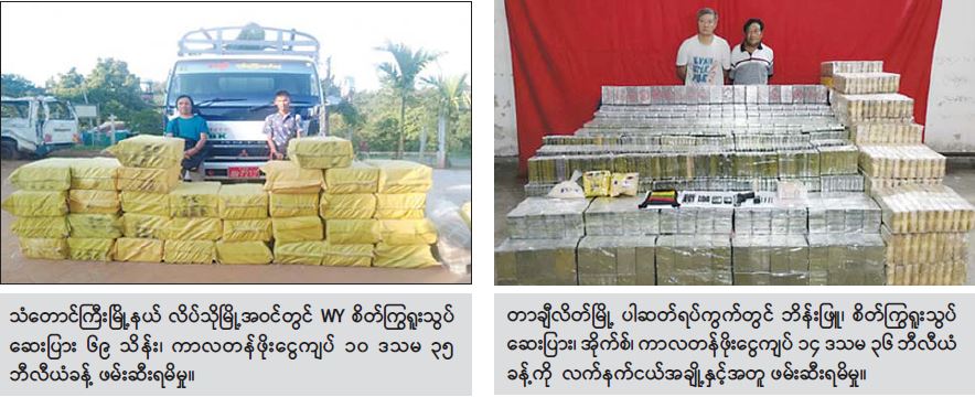 ဒီလိုဆောင်ရွက်ချက်တွေအနက် နိုင်ငံတော် စီမံအုပ်ချုပ်ရေး ကောင်စီလက်ထက်မှာ တိုင်းရင်း သားလက်နက်ကိုင်တွေ ကြီးစိုးနေတဲ့နေရာဒေသ တွေကနေ သယ်ဆောင်လာတဲ့ မူးယစ်ဆေးဝါး ဖမ်းဆီးရမိခဲ့တဲ့ ဖြစ်စဉ်တချို့ကို ကောက်နုတ် ဖော်ပြလိုပါတယ်။