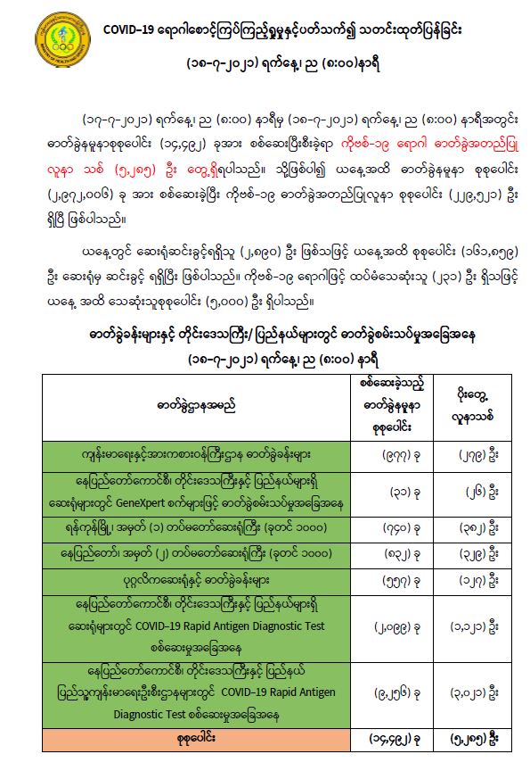 COVID-19 ရောဂါစောင့်ကြပ်ကြည့်ရှုမှုနှင့်ပတ်သက်၍ သတင်းထုတ်ပြန်ခြင်း (၁၈-၇-၂၀၂၁) ရက်နေ့၊ ည (၈:၀၀)နာရီ