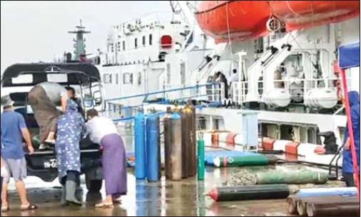 တပ်မတော်ပင်လယ်သွား ဆေးရုံရေယာဉ်(သံလွင်)တွင် တပ်ဆင်ထားရှိသော Oxygen Plant(Oxymet)မှ အောက်ဆီဂျင်များဖြည့်သွင်းပြီး ရန်ကုန်တိုင်းဒေသကြီးအတွင်းရှိ ပြည်သူ့ဆေးရုံများနှင့် လူမှုရေးအဖွဲ့အစည်းများသို့ ပေးပို့လှူဒါန်း