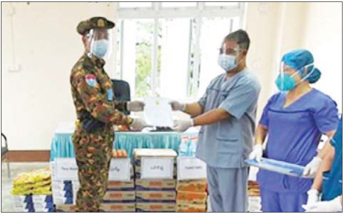 လက်ရှိအချိန်တွင် ကိုဗစ်-၁၉ ရောဂါတတိယလှိုင်းဖြစ်ပွားမှု မြင့်တက်လျက်ရှိပြီး ဓာတ်ခွဲအတည်ပြုပိုး တွေ့လူနာများနှင့် သီးသန့်စောင့်ကြည့် ရမည့်သူများကို တပ်မတော်ဆေးရုံများ၊ ပြည်သူ့ဆေးရုံများ၊ ကျန်းမာရေး ဌာနများနှင့် ကိုဗစ်စင်တာများတွင် ကျန်းမာရေးစောင့်ရှောက်မှုလုပ်ငန်း များကို တပ်မတော်သားဆရာဝန်များ၊ ကျန်းမာရေးဝန်ထမ်းများ၊ လူမှုရေးအသင်းအဖွဲ့များ ပူးပေါင်း၍ အင်တိုက်အားတိုက် ဆောင်ရွက် ပေးလျက်ရှိ၍ ထိုသို့ဆောင်ရွက်ပေးရာတွင် အထောက်အကူဖြစ်စေရန် အတွက် ကာကွယ်၊ ထိန်းချုပ်၊ ကုသရေးပစ္စည်းများ၊ အောက်ဆီဂျင်အိုး များနှင့် အာဟာရဖြည့် စားသောက်ဖွယ်ရာများကို တပ်မတော်က သွားရောက်ထောက်ပံ့ လှူဒါန်းပေးလျက်ရှိသည်။