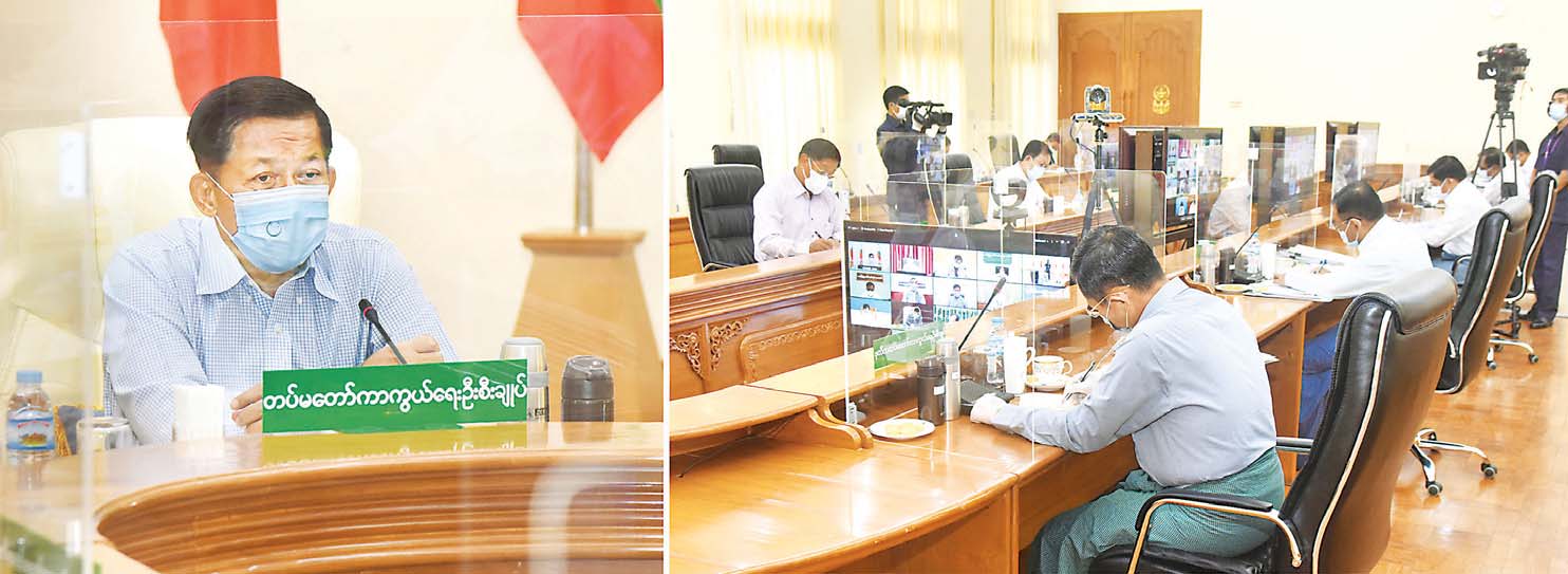 ယင်းနောက် နိုင်ငံတော်စီမံအုပ်ချုပ်ရေးကောင်စီဒုတိယဥက္ကဋ္ဌ ဒုတိယတပ်မတော် ကာကွယ်ရေး ဦးစီးချုပ် ကာကွယ်ရေးဦးစီးချုပ်(ကြည်း)၊ ကောင်စီအဖွဲ့ဝင်များ၊ ပြည်ထောင်စုဝန်ကြီးများ၊ တပ်မတော်အရာရှိကြီးများနှင့် တက်ရောက်လာကြသူများက ကိုဗစ်-၁၉ ရောဂါဖြစ်ပွားမှု အနေဖြင့် စတင်ဖြစ်ပွားချိန်မှ လက်ရှိအချိန်အထိ ၂ သိန်း ၅ သောင်းကျော်ရှိပြီဖြစ်ပြီး သေဆုံးသူ ၆၁၀၀ ကျော်ရှိပြီဖြစ်သည့်အခြေအနေ၊ ကျန်းမာရေးဝန်ထမ်းများ၊ စေတနာ့ဝန်ထမ်းများဖြင့် ပူးပေါင်းဆောင်ရွက်လျက်ရှိပြီး ပြည်သူလူထုမှလည်း ပိုမိုပူးပေါင်းဆောင်ရွက်လာသည့်အတွက် နောက်ရက်သတ္တပတ် နှစ်ပတ်အကြာတွင် ရောဂါကူးစက်မှုနှုန်း လျော့ကျလာနိုင်မည့် အခြေအနေ၊ ကာကွယ်ရေးလုပ်ငန်းတွင် မရှိမဖြစ်လိုအပ်သည့် ကာကွယ်ဆေးထိုးနှံမှုကို စနစ်တကျ ဖြစ်စေရေးအတွက် အိုင်တီနည်းပညာဖြင့် စာရင်းသွင်းပြုစုနိုင်ရေးအတွက် တပ်မတော်မှ ကွန်ပြူတာပညာရှင်များဖြင့် ဆော့ဝဲပြုလုပ်လျက်ရှိပြီး လွယ်လွယ်ကူကူဖြင့် သုံးစွဲနိုင်ရေး လုပ်ဆောင်ထားရှိကာ ပြည်နယ်နှင့် တိုင်းများရှိ ရောဂါတုံ့ပြန် ရေးအဖွဲ့များ သို့လည်း ဆက်လက်ဖြန့်ဝေပေးသွားမည့် အခြေအနေ၊ ထိုသို့ ကာကွယ်ဆေးထိုးနှံရာတွင် သေဆုံးမှုကိုလျှော့ချနိုင်ရေး ဦးစားပေးအုပ်စု၊ ရောဂါကူး စက်ပြန့်ပွားမှုကို တားဆီးရေးအတွက် လိုအပ်သည့်အုပ်စု၊ ကိုဗစ်ကြောင့် နိုင်ငံ့စီးပွားရေးထိခိုက်မှုကို ဖြစ်ပွားစေနိုင်မည့် ဦးစားပေး အုပ်စုဟူ၍ ခွဲခြား၍ ဦးစားပေး ထိုးနှံပေးသွားမည့် အခြေအနေ၊ ရောဂါ ကာကွယ် ကုသ ထိန်းချုပ်ရေးအတွက် စောင့်ကြည့်လူနာထားရှိရေး စင်တာများနှင့် အတည်ပြုလူနာ ထားရှိရေး စင်တာများ ကို ထပ်မံတိုးချဲ့ လက်ခံကုသနိုင်ရေး စီစဉ်ဆောင်ရွက်ပေးလျက်ရှိသည့် အခြေအနေ၊ ကိုဗစ်-၁၉ ရောဂါ ကာကွယ်ကုသထိန်းချုပ်ရေးလုပ်ငန်းများတွင်  အသုံးပြုနိုင်ရေး ရံပုံငွေမှ သုံးစွဲထားရှိမှု အခြေအနေ၊ လေကြောင်းလိုင်းများ၊ နယ်စပ်ဒေသများ၊ ဆိပ်ကမ်းများ၊ နယ်စပ် ဂိတ်များမှတဆင့် ရောဂါကာကွယ်ထိန်းချုပ် ကုသရေးဆိုင်ရာ ပစ္စည်းများကို  တင်သွင်းလျက် ရှိသည့် အခြေအနေနှင့် လူ့ကျန်းမာရေးနှင့် သက်ဆိုင်သောပစ္စည်းများဖြစ်၍ အချို့ သော FDA ခွင့်ပြုချက်မရှိသည့် ပစ္စည်းများကို စိစစ်ရန်လိုအပ်သည့် အခြေအနေ၊ အိမ်နီးချင်းနိုင်ငံများ တွင်လည်း ကူးစက်ပြန့်ပွားမှုနှင့် အောက်ဆီဂျင်လိုအပ်ချက် မြင့်တက်လာသည့်အတွက် ပြည်တွင်းရှိ Oxygen plant များတွင် တိုးချဲ့ထုတ်လုပ်နိုင်မည့် အခြေအနေ၊ ဝေးလံခေါင်ဖျား ဒေသများတွင် အောက်ဆီဂျင်လိုအပ်ချက်များကို ဖြည့်ဆည်ဆောင်ရွက်ပေးလျက်ရှိမှု အခြေ အနေ၊ ပို့ဆောင်ဆက်သွယ်ရေးနှင့် ပတ်သက်၍ လေကြောင်းလိုင်း၊ ရေကြောင်းလိုင်း၊ မ