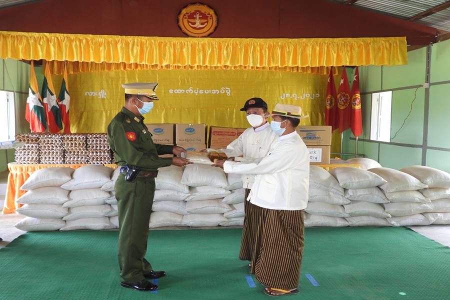 ထိုသို့ပေးအပ်လျက်ရှိရာ ယနေ့တွင် ရှမ်းပြည်နယ်(မြောက်ပိုင်း)၊ လားရှိုးမြို့ရှိ တာပုံစစ်မှုထမ်း ဟောင်းအိမ်ရာနှင့် ခေးနင်းအဆင့်မြင့်စစ်မှုထမ်းဟောင်းအိမ်ရာတို့ရှိ စစ်မှုထမ်းဟောင်းအဖွဲ့ဝင် များနှင့် နိုင်ငံတော်နှင့် တပ်မတော်အတွက် အသက်ပေး လှူခဲ့ရသည့် အရာရှိ၊ စစ်သည်များ၏ မိသားစုဝင်များအား အရှေ့မြောက်တိုင်း စစ်ဌာနချုပ် တိုင်းမှူး ဗိုလ်ချုပ် နိုင်နိုင်ဦးနှင့် တာဝန်ရှိ သူများက အဆိုပါအိမ်ရာများ၌ သွားရောက်တွေ့ဆုံပြီး ကိုဗစ်-၁၉ ရောဂါကာကွယ်ရေး အထောက်အကူပြုပစ္စည်းများ၊ ဆန်၊ ဆီနှင့် စားသောက်ဖွယ်ရာများကို ထောက်ပံ့ပေးအပ်သည်။ အလားတူ ယနေ့နက်ပိုင်းတွင် မန္တလေးတိုင်းဒေသကြီး၊ မန္တလေးမြို့၊ ချမ်းအေးသာစံမြို့နယ်၊ ကန်ကောက်ရပ်နေပြည်သူ အိမ်ထောင်စု ၂၀၀ စုတို့အတွက် အလယ်ပိုင်းတိုင်းစစ်ဌာနချုပ်၊ နယ်မြေခံတပ်မတော်သားများက ဆန်နှင့် စားသောက် ဖွယ်ရာများကို ပြည်သူများ၏ လက်ဝယ်အရောက် ပေးဝေလှူဒါန်းခဲ့ကြောင်း သတင်း ရရှိသည်။