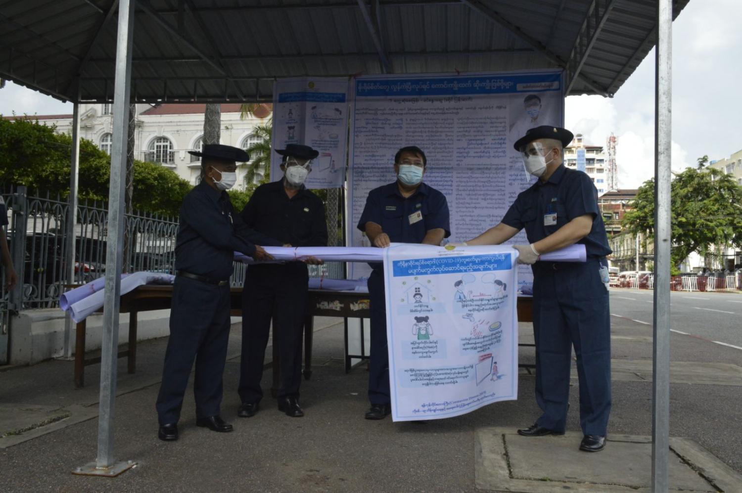 ရန်ကုန်တိုင်းဒေသကြီး ကိုဗစ်-၁၉ ထိန်းချုပ်ရေးနှင့် အရေးပေါ် တုံ့ပြန်ရေး ကော်မတီမှ ထုတ်ဝေသည့် အလျား(၃)ပေ ၊ အနံ(၂)ပေ (၄) လက်မရှိ “ကိုရိုနာဗိုင်းရပ်စ် ရောဂါ ကူးစက်မှုမှ ကာကွယ်ရန် မပျက်မကွက် လုပ်ဆောင်ရမည့် အချက်များ” ခေါင်းစဉ်ပါ ပညာပေးပိုစတာနှင့် (၆)ပေ ပတ်လည်ရှိ “စိုးရိမ်စိတ် တွေလွန်ကဲပြီးလုပ်ရင် ကောင်းကျိုးထက်ဆိုးကျိုးဖြစ်ဖို့များ” ခေါင်းစဉ်ဖြင့် တွေ့ဆုံမေးမြန်းခန်း ဆောင်းပါး ပညာပေးပိုစတာများကို ရန်ကုန်မြို့တော်စည်ပင် သာယာရေးကော်မတီအတွင်းရှိ ခရိုင်(၄)ခရိုင်မှစည်ပင်သာယာ အုပ်ချုပ်ရေးမှူးများကို ပေးအပ် သည့်အခမ်းအနားကို ယနေ့ညနေပိုင်းက ရန်ကုန်မြို့တော် စည်ပင်သာယာရေးကော်မတီ၊ မြို့တော်ခန်းမ ရှေ့၌ကျင်းပရာ ရန်ကုန်မြို့တော်စည်ပင်သာယာရေးကော်မတီ ကိုဗစ်-၁၉ ရောဂါ ကာကွယ်၊ ထိန်းချုပ်၊ ကုသရေးကော်မတီနာယက ဒုတိယမြို့တော်ဝန် ဦးညီညီ၊ လုပ်ငန်း ကော်မတီဥက္ကဋ္ဌ ရန်ကုန်မြို့တော် စည်ပင်သာယာရေး ကော်မတီအတွင်းရေးမှူး ဦးညွန့်ဖေ တို့က တာဝန်ရှိသူများထံ ပေးအပ်ကြသည်။