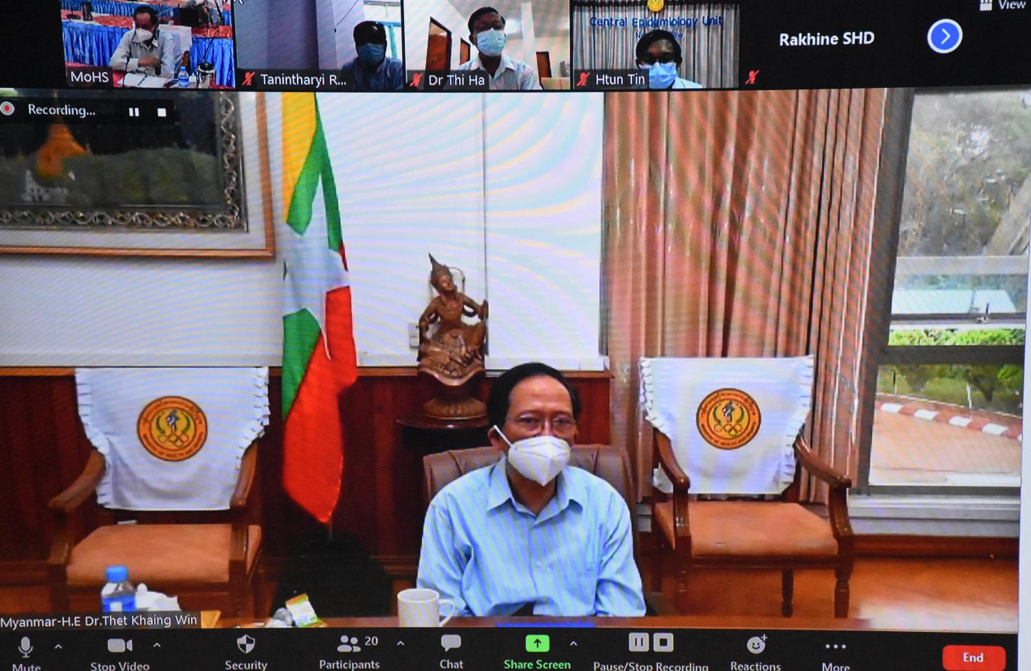 ကျန်းမာရေးနှင့် အားကစားဝန်ကြီးဌာန၊ ကိုဗစ်-၁၉ ရောဂါ ဖြစ်ပွားနေစဉ်ကာလအတွင်း သဘာဝ ဘေးအန္တရာယ်များကြောင့် ဖြစ်ပွားလာနိုင်သည့် ရောဂါများ ကြိုတင်ကာကွယ် ထိန်းချုပ်ရေးနှင့် ကိုဗစ်-၁၉ ကာကွယ်ဆေးဆက်လက်ထိုးနှံရေးလုပ်ငန်းညှိနှိုင်းအစည်းအဝေးကို ယနေ့ မွန်းလွဲပိုင်းတွင် ကျန်းမာရေးနှင့် အားကစားဝန်ကြီးဌာန၊ နေပြည်တော်၌ ဗွီဒီယိုကွန်ဖရင့် စနစ်ဖြင့် ကျင်းပသည်။