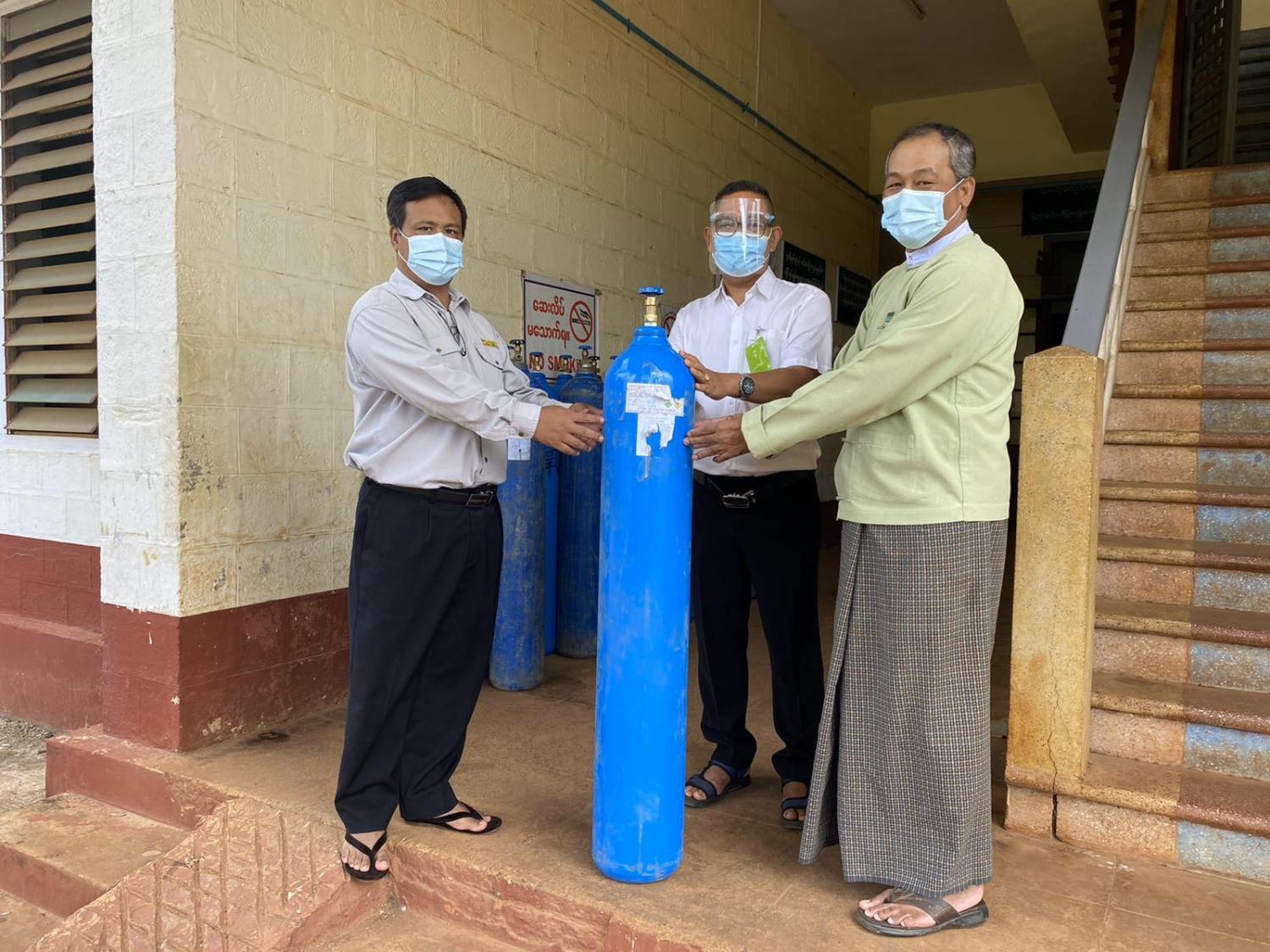 အဆိုပါ လက်ခံရရှိခဲ့သော 40 Liter Oxygen အိုး အလုံး(၅၀) မှ (၂၅)လုံးကို လားရှိုးခရိုင်အတွင်း ကိုဗစ်-၁၉ ကူးစက်ရောဂါကာကွယ်ထိန်းချုပ် တားဆီးကုသရေး လုပ်ငန်းများ ဆောင်ရွက်နိုင်ရန်အတွက် ဇူလိုင် ၂၈ ရက်တွင် ရှမ်းပြည်နယ်၊ လားရှိုးမြို့ရှိ ကိုဗစ်-၁၉ ကာကွယ်ထိန်းချုပ်ကုသရေး ခရိုင်အဆင့် လုပ်ငန်းကော်မတီသို့ ဆောက်လုပ်ရေးဝန်ကြီးဌာန ၊ တံတားဦးစီးဌာနမှ ပေးအပ်လှူဒါန်းခဲ့ကြောင်း သိရသည်။