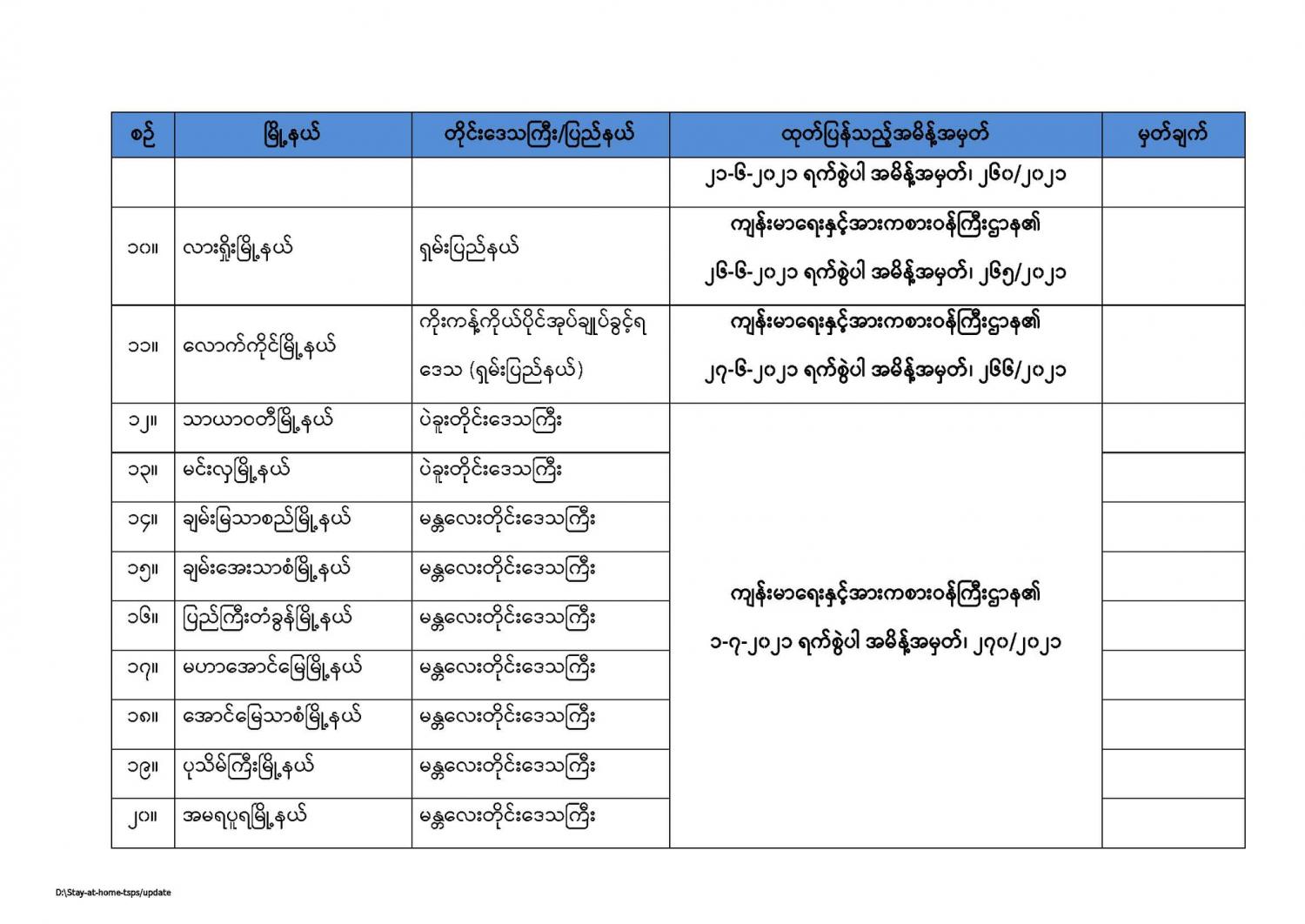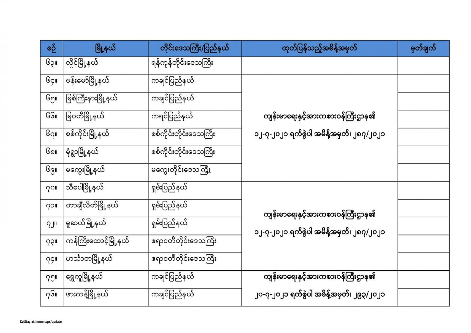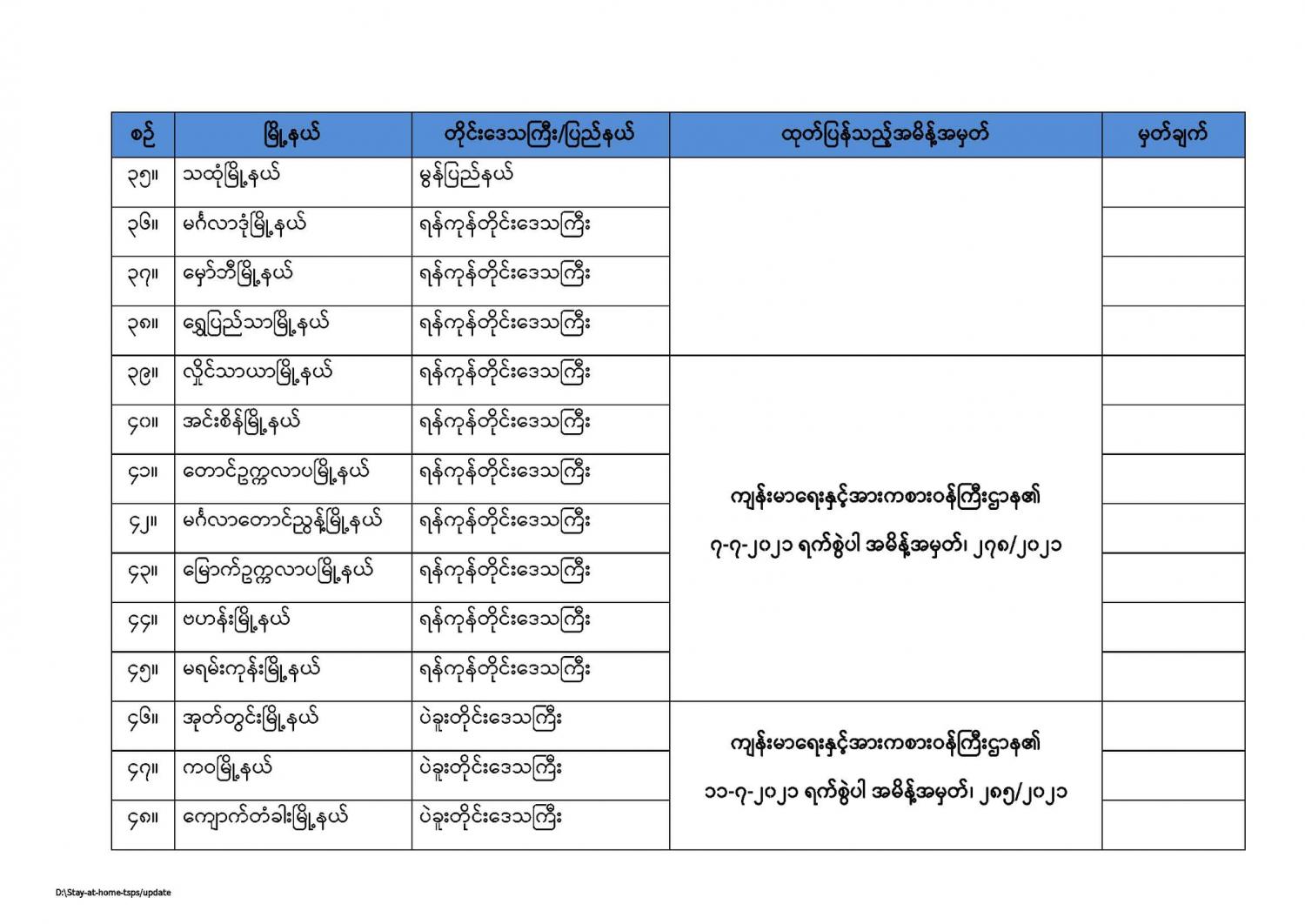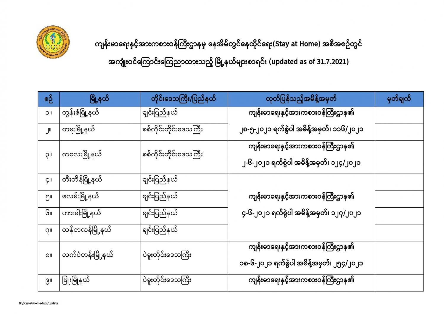ကျန်းမာရေးနှင့်အားကစားဝန်ကြီးဌာနမှ နေအိမ်တွင်နေထိုင်ရေး(Stay at Home) အစီအစဉ်တွင်အကျုံးဝင်ကြောင်းကြေညာထားသည့် မြို့နယ်များစာရင်း (updated as of 31.7.2021) 07/31/2021