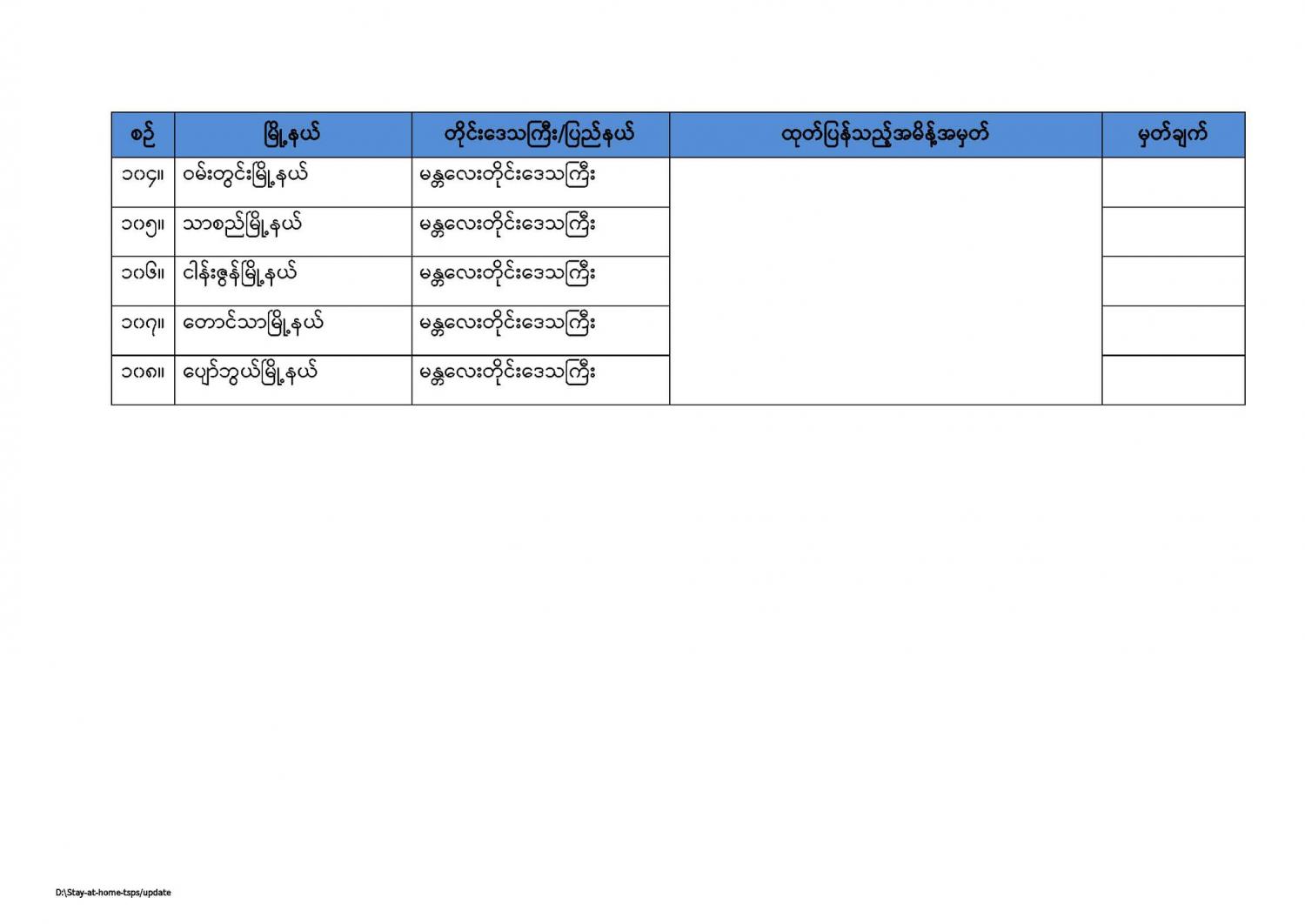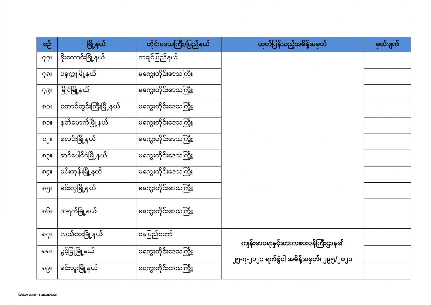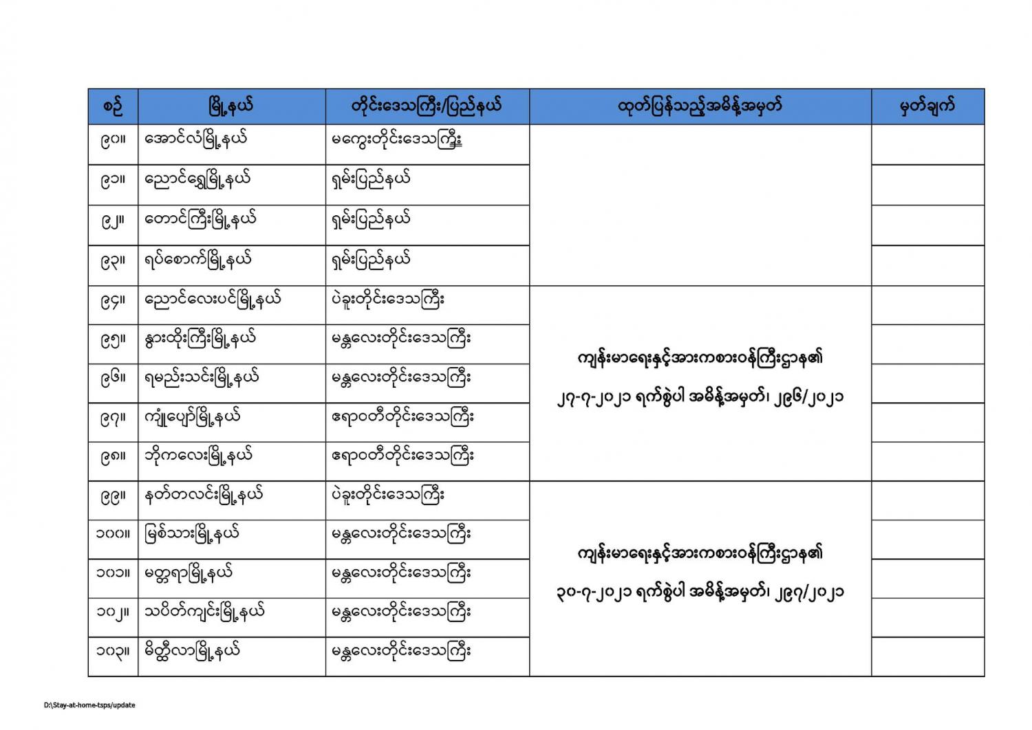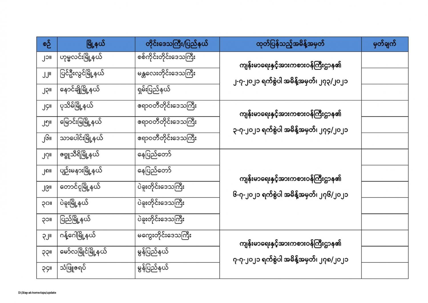 ကျန်းမာရေးနှင့်အားကစားဝန်ကြီးဌာနမှ နေအိမ်တွင်နေထိုင်ရေး(Stay at Home) အစီအစဉ်တွင်အကျုံးဝင်ကြောင်းကြေညာထားသည့် မြို့နယ်များစာရင်း (updated as of 31.7.2021) 07/31/2021