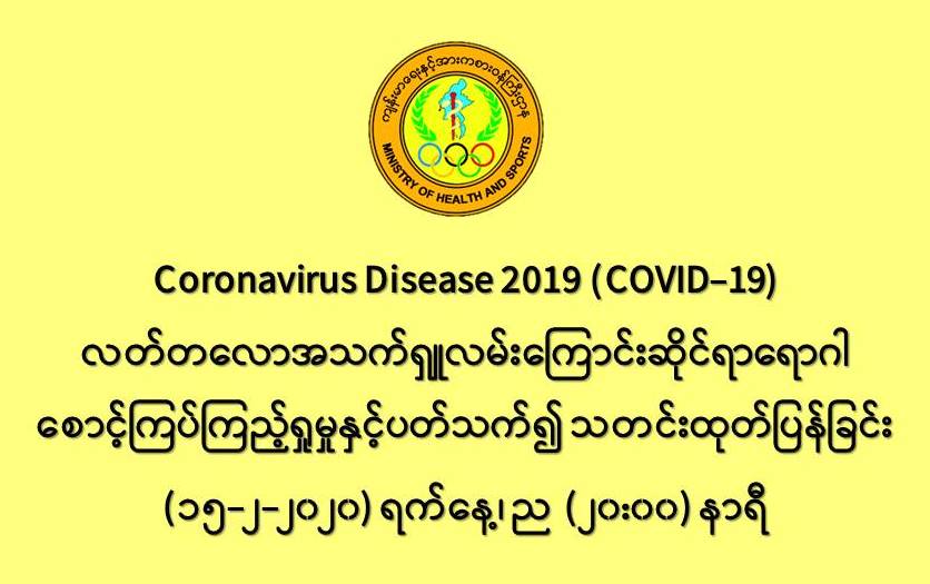 ၁။ ကျန်းမာရေးနှင့်အားကစားဝန်ကြီးဌာနသည် တရုတ်ပြည်သူ့သမ္မတနိုင်ငံနှင့် ကမ္ဘာ့နိုင်ငံ အချို့တွင် ကူးစက်ပျံ့နှံ့လျက်ရှိသည့် COVID-19 လတ်တလောအသက်ရှူလမ်းကြောင်းဆိုင်ရာ ရောဂါ ဖြစ်ပွားမှုဖြစ်စဉ်နှင့်ပတ်သက်၍ ရောဂါစောင့်ကြပ်ကြည့်ရှုခြင်း လုပ်ငန်းများအား အပြည်ပြည်ဆိုင်ရာဝင် ထွက်ဂိတ်များတွင်လည်းကောင်း၊ ဆေးရုံအခြေပြုအဖြစ်လည်းကောင်း၊ ပြည်သူ လူထု အခြေပြု စောင့်ကြပ်ကြည့်ရှုခြင်း လုပ်ငန်းများဖြင့်လည်းကောင်း၊ ပုဂ္ဂလိကဆေးရုံများနှင့် ပူးပေါင်း၍ လည်းကောင်း ဆောင်ရွက် လျက်ရှိပါသည်။