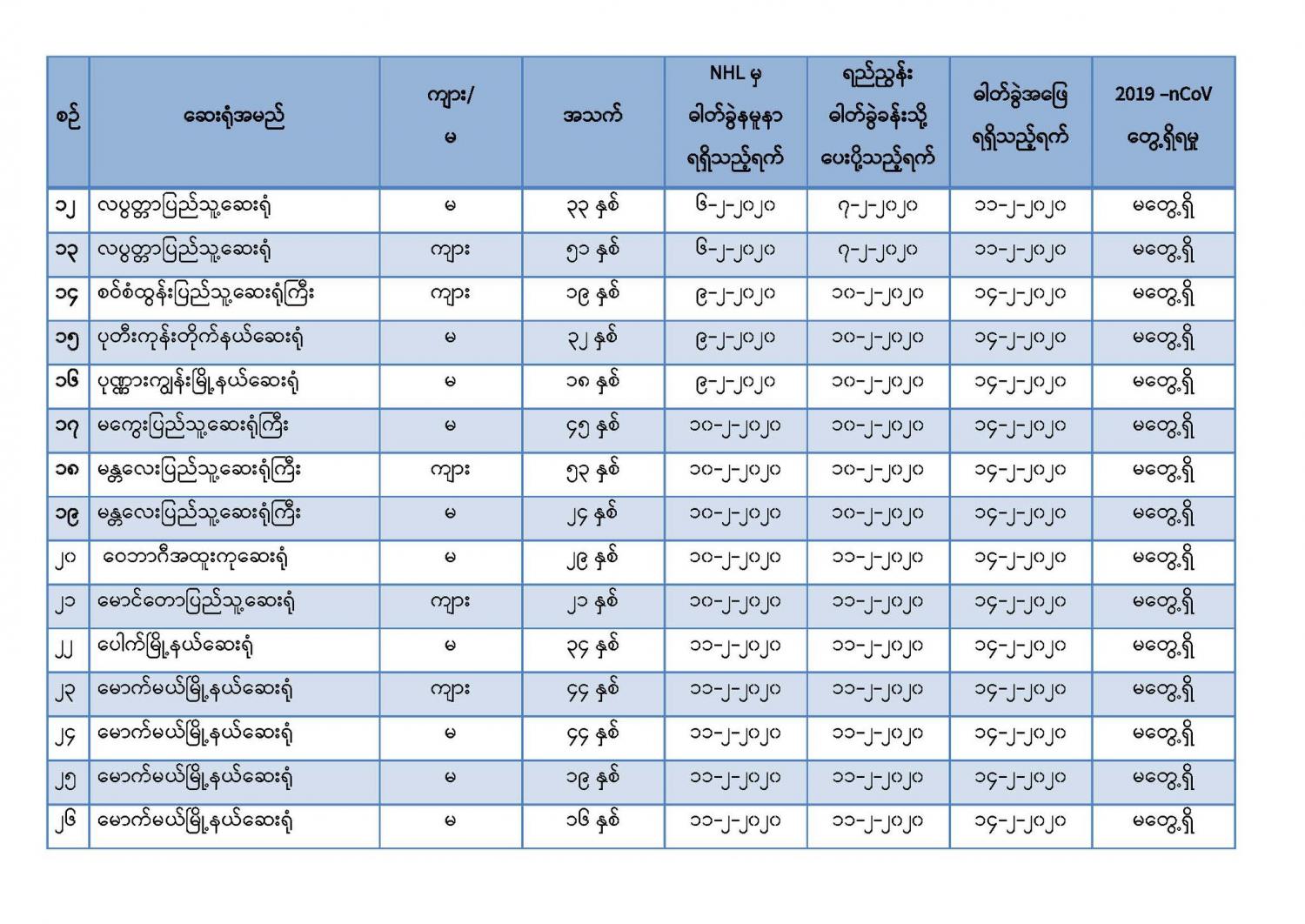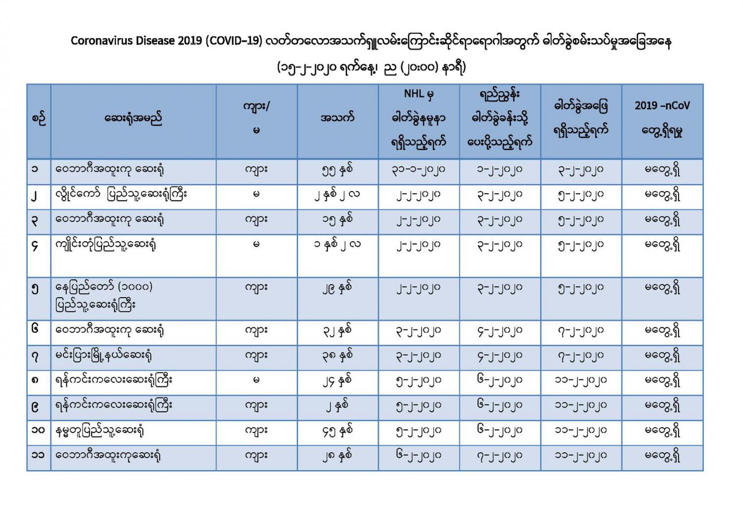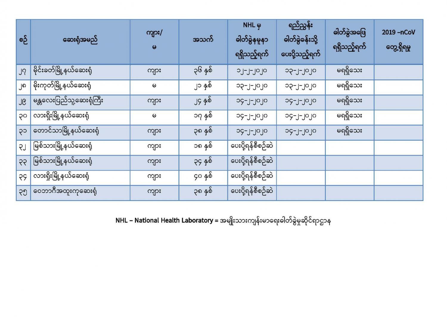၂။ ထိုသို့ဆောင်ရွက်ရာ တရုတ်ပြည်သူ့သမ္မတနိုင်ငံ၊ ယူနန်ပြည်နယ်၊ လျန်ဟဲမြို့နေ၊ အသက် (၃၈) နှစ်အရွယ် အမျိုးသားတစ်ဦး သည် (၉-၂-၂၀၂၀) ရက်နေ့တွင် မြန်မာနိုင်ငံသို့ ရောက်ရှိခဲ့ပြီး (၁၄-၂-၂၀၂၀) ရက်နေ့မှစတင်၍ ဖျားခြင်း၊ လည်ချောင်းနာခြင်းနှင့် ဝမ်းသွားခြင်း လက္ခဏာများ ခံစားခဲ့ရသဖြင့် ရန်ကုန်ပြည်သူ့ဆေးရုံကြီးသို့ သွားရောက်ပြသခဲ့ရာ ဝေဘာဂီအထူးကုဆေးရုံသို့ ညွှန်းပို့ခဲ့ပါသည်။ အဆိုပါလူနာအား စောင့်ကြည့်လူနာအဖြစ် သတ်မှတ်၍ သီးခြားထားရှိကုသမှုပေး လျက်ရှိပြီး ၎င်းထံမှ ဓါတ်ခွဲ နမူနာရယူ၍ ရည်ညွန်းဓါတ်ခွဲခန်းသို့ ပေးပို့စစ်ဆေးရန် စီစဉ်ဆောင်ရွက် လျက်ရှိပါသည်။ လူနာအား လတ်တလောစစ်ဆေးချက် များအရ အခြားပြင်းထန်အသက်ရှူ လမ်းကြောင်းဆိုင်ရာ လက္ခဏာများ မတွေ့ရှိရပါ။