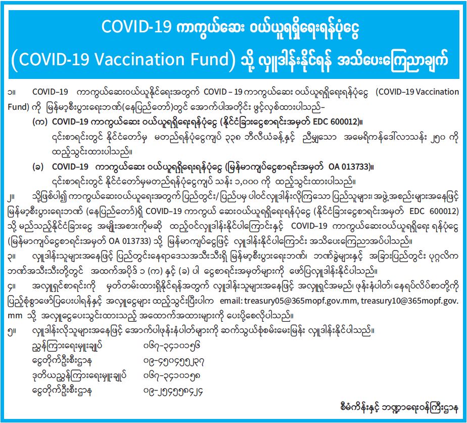 COVID-19 ကာကွယ်ဆေး ဝယ်ယူရရှိရေးရန်ပုံငွေ (COVID-19 Vaccination Fund) သို့ လှူဒါန်းနိုင်ရန် အသိပေးကြေညာချက်
