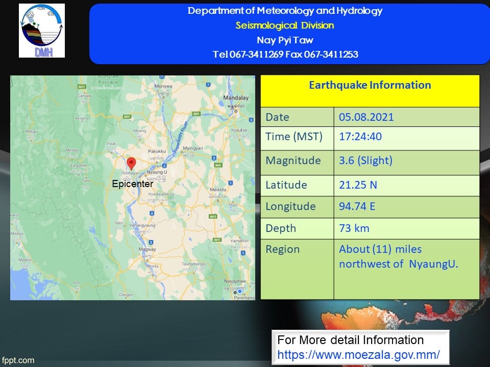 ၂၀၂၁ ခုနှစ်၊ သြဂုတ်လ (၅)ရက်နေ့၊ မြန်မာစံတော်ချိန် (၁၇)နာရီ၊ (၂၄)မိနစ်၊ (၄၀)စက္ကန့်အချိန် တွင် ညောင်ဦးမြေငလျင်စခန်းမှ အနောက်မြောက်ဘက် (၁၁)မိုင်ခန့်အကွာ၊ မြန်မာနိုင်ငံပြည်တွင်း (ညောင်ဦးမြို့၏ အနောက်မြောက်ဘက် (၁၁)မိုင်ခန့်အကွာ)၊ မြောက်လတ္တီတွဒ် (၂၁.၂၅)ဒီဂရီ၊ အရှေ့ လောင်ဂျီတွဒ် (၉၄.၇၄)ဒီဂရီ၊ အနက်(၇၃)ကီလိုမီတာကို ဗဟိုပြု၍ အင်အားရစ်(ခ်)တာစကေး (၃.၆) အဆင့်ရှိ အင်အားအနည်းငယ်ရှိသော မြေငလျင်တစ်ခု လှုပ်ရှားသွားကြောင်း တိုင်းထွာရရှိပါသည်။ #မိုးလေဝသနှင့်ဇလဗေဒညွှန်ကြားမှူးဦးစီးဌာန
