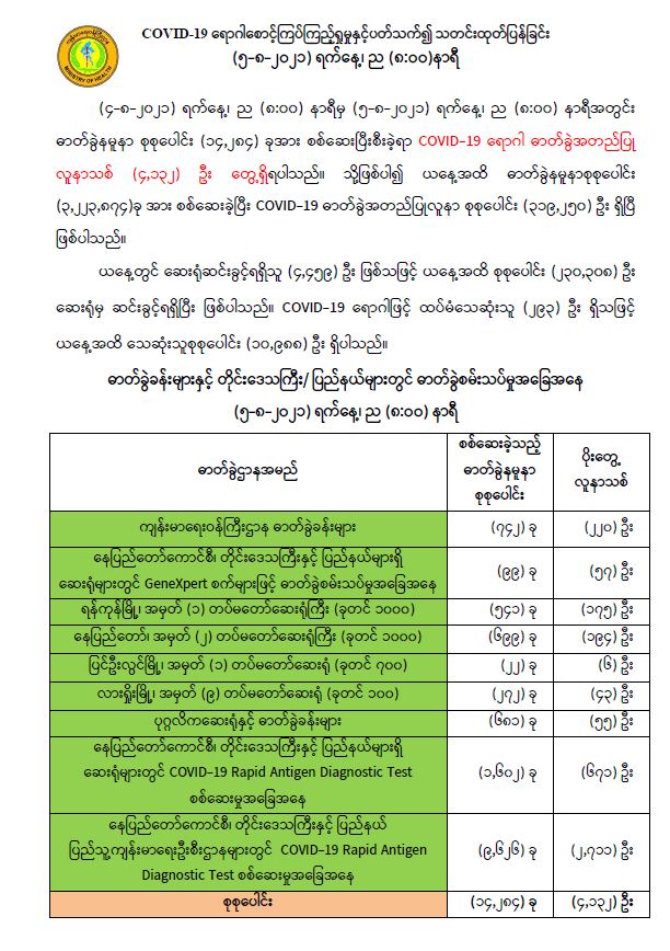 COVID-19 ရောဂါ စောင့်ကြပ်ကြည့်ရှုမှုနှင့် ပတ်သက်၍ သတင်းထုတ်ပြန်ခြင်း (၅-၈-၂၀၂၁) ရက်နေ့၊ ည (၈:၀၀)နာရီ