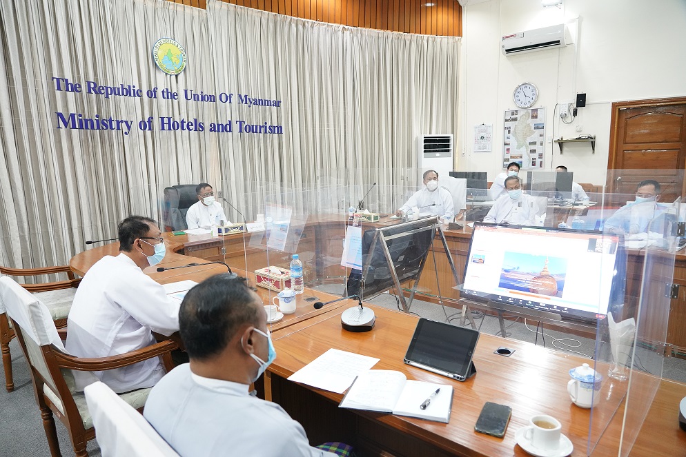 ဟိုတယ်နှင့်ခရီးသွားဆိုင်ရာ ဝန်ဆောင်မှုလုပ်ငန်းများကို ဘေးကင်းလုံခြုံသော ဝန်ဆောင်မှု လုပ်ငန်းများအဖြစ် အသိအမှတ်ပြုလက်မှတ်များ Online မှတစ်ဆင့် လျှောက်ထားအတည်ပြု ထုတ်ပေးနိုင်ရေးအတွက် “Enchanting Myanmar Health and Safety Protocol” Website မိတ်ဆက်ရှင်းလင်းခြင်း အခမ်းအနားကို ယနေ့ ညနေပိုင်းတွင် ဟိုတယ်နှင့် ခရီးသွားလာရေး ဝန်ကြီးဌာန၊ နီလာအစည်းအဝေးခန်းမVideo Conferencing စနစ်ဖြင့် ကျင်းပပြုလုပ်သည်။