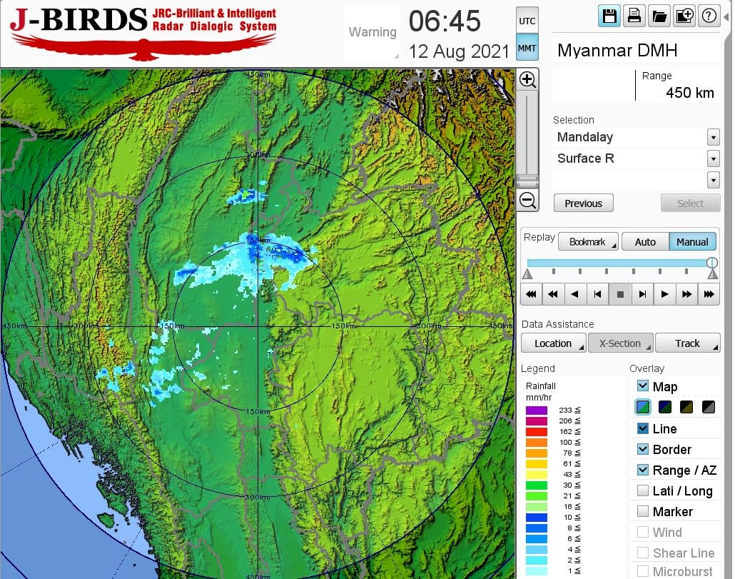 မန္တလေးမြို့နှင့် အနီးတစ်ဝိုက်အတွက် ယနေ့ညနေအထိ ခန့်မှန်းချက်။ နေရာကွက်ကျား မိုးထစ်ချုန်းရွာမည်။ ရွာရန်ရာနှုန်းပြည့် ဖြစ်ပါသည်။