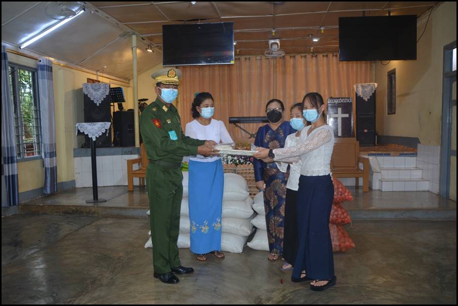 ထိုသို့ပေးအပ်လျက်ရှိရာ ယနေ့တွင် ရှမ်းပြည်နယ်(မြောက်ပိုင်း)၊ လားရှိုးမြို့နယ်၊ ရပ်ကွက် (၁၀)ရှိ ဧလိမ်မိဘမဲ့ဂေဟာနှင့် ရပ်ကွက်(၁)ရှိ ‘‘ဝ” မိဘမဲ့ရိပ်သာတို့ရှိ မိဘမဲ့ကလေးငယ်များ အတွက် တာဝန်ရှိသူများအား အရှေ့မြောက်တိုင်းစစ်ဌာနချုပ် တိုင်းမှူး ဗိုလ်ချုပ် နိုင်နိုင်ဦး၊ လားရှိုးခရိုင်စီမံအုပ်ချုပ်မှုအဖွဲ့ ဉက္ကဋ္ဌ ဦးမျိုးမင်းထွန်းနှင့် တာဝန်ရှိသူများက ဆန်၊ ဆီ၊ ပဲ၊ စားသောက်ကုန်ပစ္စည်းများနှင့် Mask ၂၀၀၀ ခုတို့အားလည်းကောင်း၊ ဧရာဝတီတိုင်းဒေသကြီး၊ ကန်ကြီးထောင့်မြို့၊ မြို့ပေါ်ရပ်ကွက်များရှိ ပြည်သူအိမ်ထောင်စု ၃၀၀ စုတို့အတွက် စားသောက် ကုန်ပစ္စည်းများအား မြို့နယ်စီမံအုပ်ချုပ်ရေး ကောင်စီအဖွဲ့ဝင်များနှင့် စေတနာရှင် အလှူရှင် များကလည်းကောင်း၊ မန္တလေးတိုင်းဒေသကြီး၊ မဟာအောင်မြေမြို့နယ်၊ ရဲမွန်တောင် ရပ်ကွက်နေ ပြည်သူအိမ်ထောင်စု ၂၀၀ စု တို့အတွက် ဆန်နှင့် စားသောက်ဖွယ်ရာများအား အလယ်ပိုင်းတိုင်းစစ်ဌာနချုပ်မှ နယ်မြေခံတပ်မတော်သားများက လည်းကောင်း အသီးသီး ထောက်ပံ့ပေးအပ်ခဲ့ကြကြောင်း သတင်းရရှိသည်။