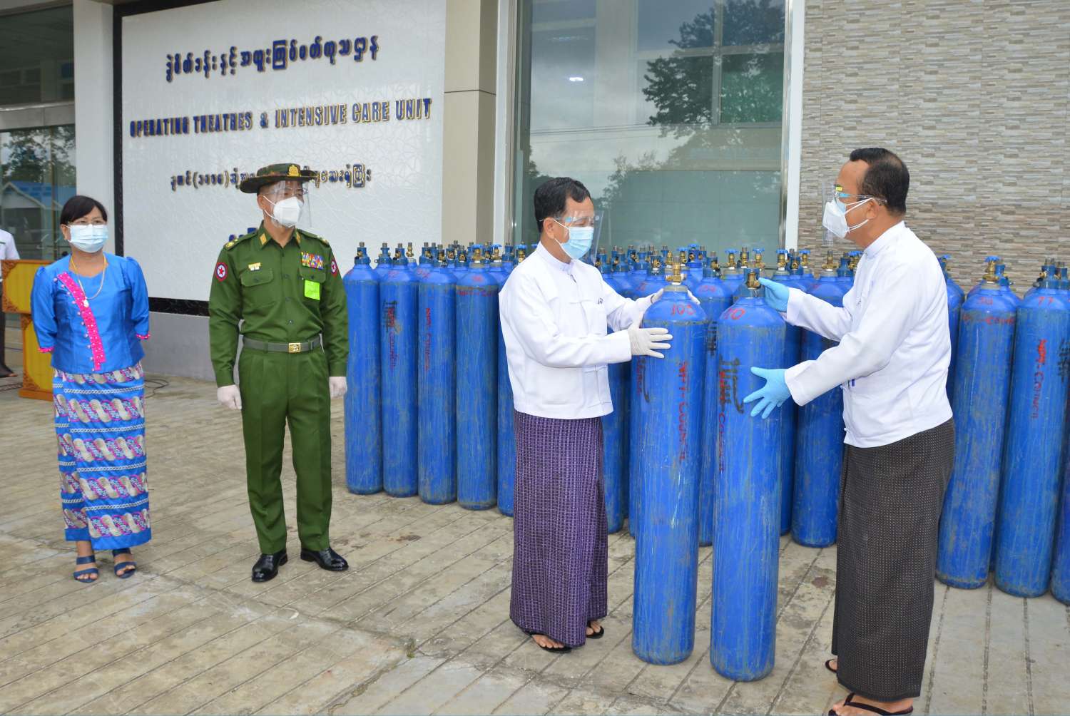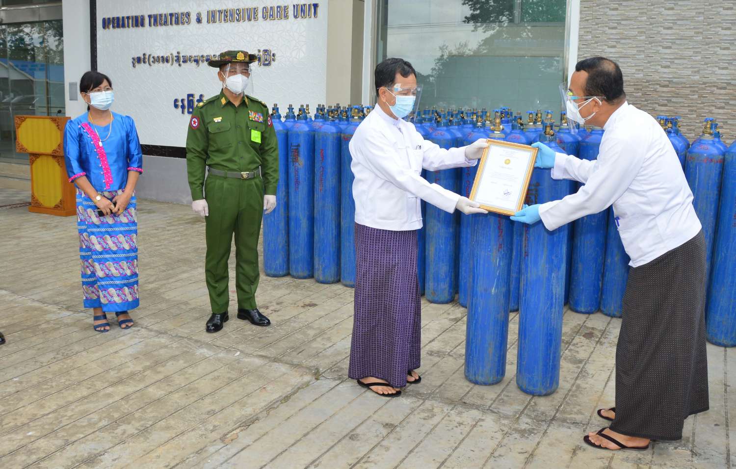 ထို့နောက် နေပြည်တော်ကောင်စီဥက္ကဋ္ဌမှ အောက်ဆီဂျင်အိုးများအား နေပြည်တော် ပြည်သူ့ ဆေးရုံကြီး ခုတင်(၁၀၀၀) ဆေးရုံအုပ်ကြီး ဒေါက်တာအောင်ငွေစံထံသို့ ပေးအပ်လှူဒါန်းရာ ဆေးရုံအုပ်ကြီးက ဂုဏ်ပြုမှတ်တမ်းလွှာ ပြန်လည်ပေးအပ်ပြီး ကျေးဇူးတင်စကား ပြောကြား သည်။