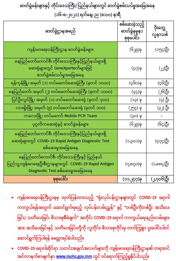 သို့ဖြစ်ပါ၍ ယနေ့အထိ ဓာတ်ခွဲနမူနာစုစုပေါင်း(၃,၃၅၈,၂၁၂)ခုအား စစ်ဆေးခဲ့ပြီး COVID-19 ဓာတ်ခွဲအတည်ပြုလူနာ စုစုပေါင်း (၃၅၆,၉၈၅) ဦး ရှိပြီ ဖြစ်ပါသည်။