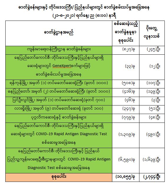 သို့ဖြစ်ပါ၍ ယနေ့အထိ ဓာတ်ခွဲနမူနာစုစုပေါင်း(၃,၄၁၇,၂၁၈)ခုအား စစ်ဆေးခဲ့ပြီး COVID-19 ဓာတ်ခွဲအတည်ပြုလူနာ စုစုပေါင်း (၃၇၁,၅၁၂) ဦး ရှိပြီ ဖြစ်ပါသည်။