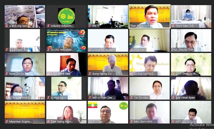 နေပြည်တော်ကောင်စီနယ်မြေ ဖွံ့ဖြိုးတိုးတက်ရေး ညှိနှိုင်းအစည်းအဝေးကို ယနေ့နံနက်ပိုင်းတွင် Video conferencing စနစ်ဖြင့် ကျင်းပပြုလုပ်ရာ စက်မှုဝန်ကြီးဌာန ပြည်ထောင်စုဝန်ကြီး ဒေါက်တာ ချာလီသန်း၊ ဒုတိယဝန်ကြီးနှင့် တာဝန်ရှိသူများ၊ မြန်မာနိုင်ငံ အင်ဂျင်နီယာကောင်စီမှ နာယက၊ ဥက္ကဋ္ဌနှင့် အဖွဲ့ဝင်များ တက်ရောက်ကြသည်။