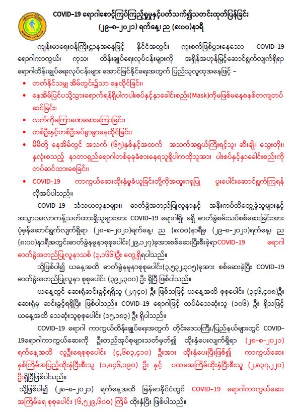 COVID-19 ရောဂါစောင့်ကြပ်ကြည့်ရှုမှုနှင့်ပတ်သက်၍သတင်းထုတ်ပြန်ခြင်း (၂၉-၈-၂၀၂၁) ရက်နေ့၊ ည (၈:၀၀)နာရီ 08/29/2021