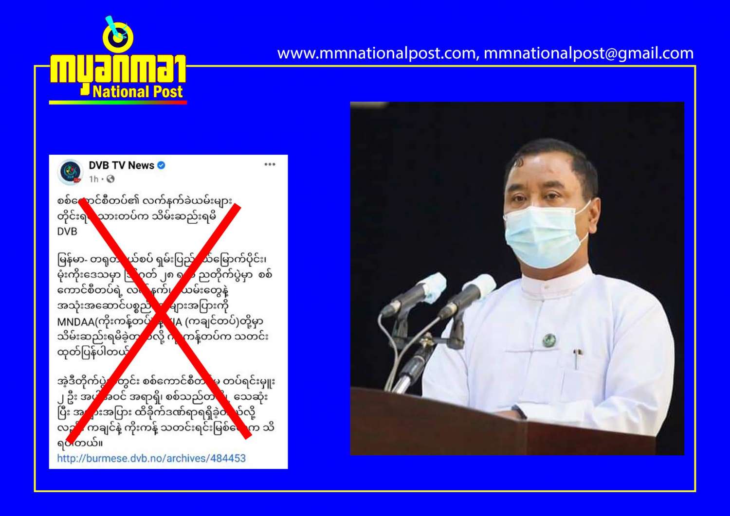 အကြမ်းဖက်အားပေးသတင်းဌာန DVB က စစ်ကောင်စီတပ်၏ လက်နက်ခဲယမ်းများ တိုင်းရင်းသားတပ်က သိမ်းဆည်းရမိဟု ဖော်ပြခဲ့ပြီး တပ်မတော်ဘက်မှ စစ်လက်နက်ပစ္စည်း အမြောက်အများကို သိမ်းဆည်းရမိသယောင် ဖော်ပြထားခြင်းဖြစ်ပါတယ်။