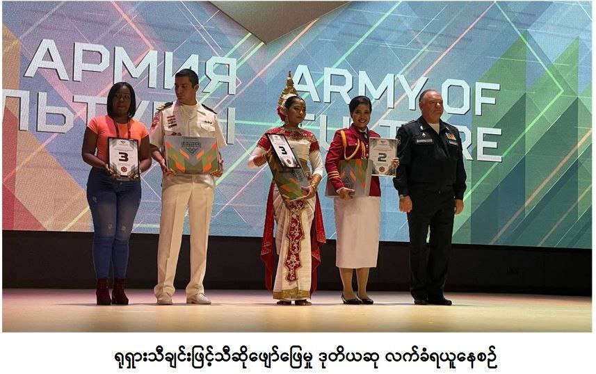 ထိုသို့ ဝင်ရောက်ယှဉ်ပြိုင်လျက်ရှိသည့် မြန်မာ့တပ်မတော်မှ ယဉ်ကျေးမှု တပ်ဖွဲ့ဝင်များသည် ဩဂုတ် ၂၂ ရက်မှစတင်၍ နိုင်ငံပေါင်း ၁၅ နိုင်ငံမှ ပြိုင်ပွဲဝင် ရိုးရာယဉ်ကျေးမှု တပ်ဖွဲ့ဝင်များနှင့်အတူ ပြိုင်ပွဲအသီးသီးတွင် ဝင်ရောက်ယှဉ်ပြိုင်ခဲ့ရာ ရိုးရာဝတ်စုံဖြင့် ဖျော်ဖြေတင်ဆက်ပြသမှုတွင် ပထမဆု၊ ရုရှားသီချင်းဖြင့် တစ်ဦးချင်းသီဆိုဖျော်ဖြေတင်ဆက်မှုတွင် ဒုတိယဆု၊ နိုင်ငံ့ရိုးရာ ယဉ်ကျေးမှုကို ပေါ်လွင်ထင်ဟပ်အောင်ဖျော်ဖြေတင်ဆက်ပြသမှုတွင် ဒုတိယဆု တို့ကို ဆွတ်ခူးရရှိခဲ့ သည့်အပြင် အွန်လိုင်းမှတဆင့် ပရိသတ်များ၏ မဲပေးရွေးချယ်မှုတွင်လည်း တတိယဆုကို ရရှိ အောင် စွမ်းဆောင်နိုင်ခဲ့သည်။