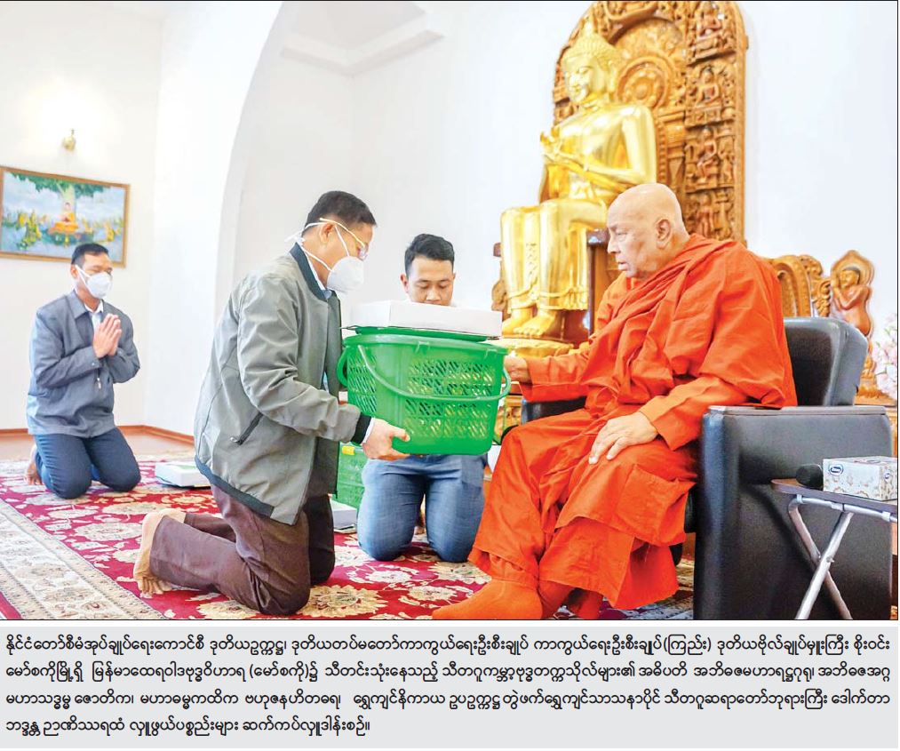 ယနေ့နံနက်ပိုင်းတွင် နိုင်ငံတော်စီမံအုပ်ချုပ်ရေးကောင်စီ ဒုတိယဥက္ကဋ္ဌ၊ ဒုတိယ တပ်မတော် ကာကွယ်ရေးဦးစီးချုပ် ကာကွယ်ရေးဦးစီးချုပ်(ကြည်း)နှင့် ကိုယ်စားလှယ်အဖွဲ့ဝင်များသည် မော်စကိုမြို့ရှိ မြန်မာထေရဝါဒ ဗုဒ္ဓဝိဟာရ(မော်စကို)သို့ သွားရောက်ပြီး ကျောင်း၌သီတင်းသုံးနေသည့် သီတဂူကမ္ဘာ့ ဗုဒ္ဓတက္ကသိုလ်များ၏ အဓိပတိ အဘိဓဇ မဟာရဋ္ဌဂုရု၊ အဘိဓဇ အဂ္ဂမဟာသဒ္ဓမ္မဇောတိက၊ မဟာဓမ္မ ကထိက ဗဟုဇနဟိတဓရ၊ ရွှေကျင်နိကာယ ဥပဥက္ကဋ္ဌ တွဲဖက် ရွှေကျင်သာသနာပိုင် သီတဂူ ဆရာတော်ဘုရားကြီး ဒေါက်တာဘဒ္ဒန္တဉာဏိဿရ နှင့် ကျောင်းထိုင်ဆရာတော် ဒေါက်တာဘဒ္ဒန္တအစ္ဆရိယတို့အား ဖူးမြော်ကြည်ညိုကာ လှူဖွယ်ပစ္စည်းများနှင့် နေ့ဆွမ်း ဆက်ကပ် လှူဒါန်းသည်။