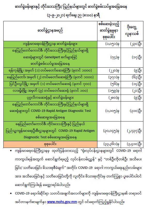 သို့ဖြစ်ပါ၍ ယနေ့အထိ ဓာတ်ခွဲနမူနာစုစုပေါင်း(၃,၇၂၂,၁၇၁)ခုအား စစ်ဆေးခဲ့ပြီး COVID-19 ဓာတ်ခွဲအတည်ပြုလူနာ စုစုပေါင်း (၄၀၉,၅၀၉) ဦးရှိပြီ ဖြစ်ပါသည်။