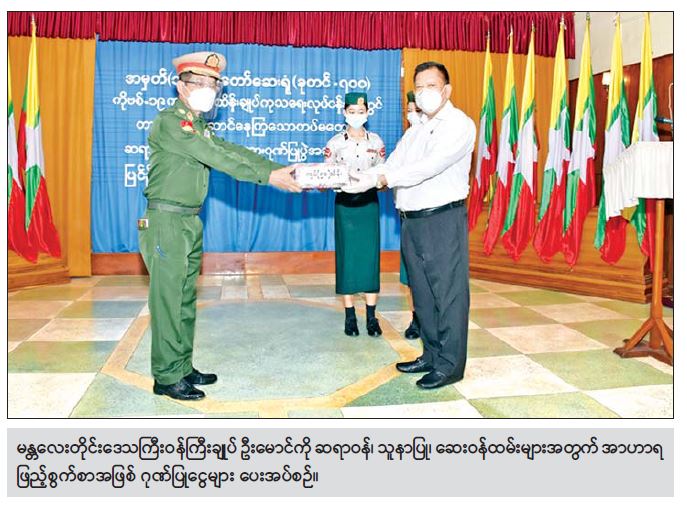 ဆက်လက်၍ တိုင်းဒေသကြီး ဝန်ကြီးချုပ်က ကိုဗစ်-၁၉ ရောဂါပိုးတွေ့ရှိ အရပ်ဘက် လူနာများကို ကုသစောင့်ရှောက်ပေးခဲ့ကြသည့် ဆရာဝန်၊ သူနာပြု၊ ဆေးဝန်ထမ်းများအတွက် အာဟာရဖြည့်စွက်စာအဖြစ် ဂုဏ်ပြုငွေကျပ်သိန်း ၅၀ ကို ပေးအပ်ရာ အမှတ်(၁) တပ်မတော် ဆေးရုံ ခုတင်(၇၀၀) ဆေးရုံ တပ်မှူး ဗိုလ်မှူးချုပ်မျိုးသန့်က လက်ခံယူပြီး ကျေးဇူးတင်စကား ပြောကြားကြောင်း သတင်းရရှိသည်။